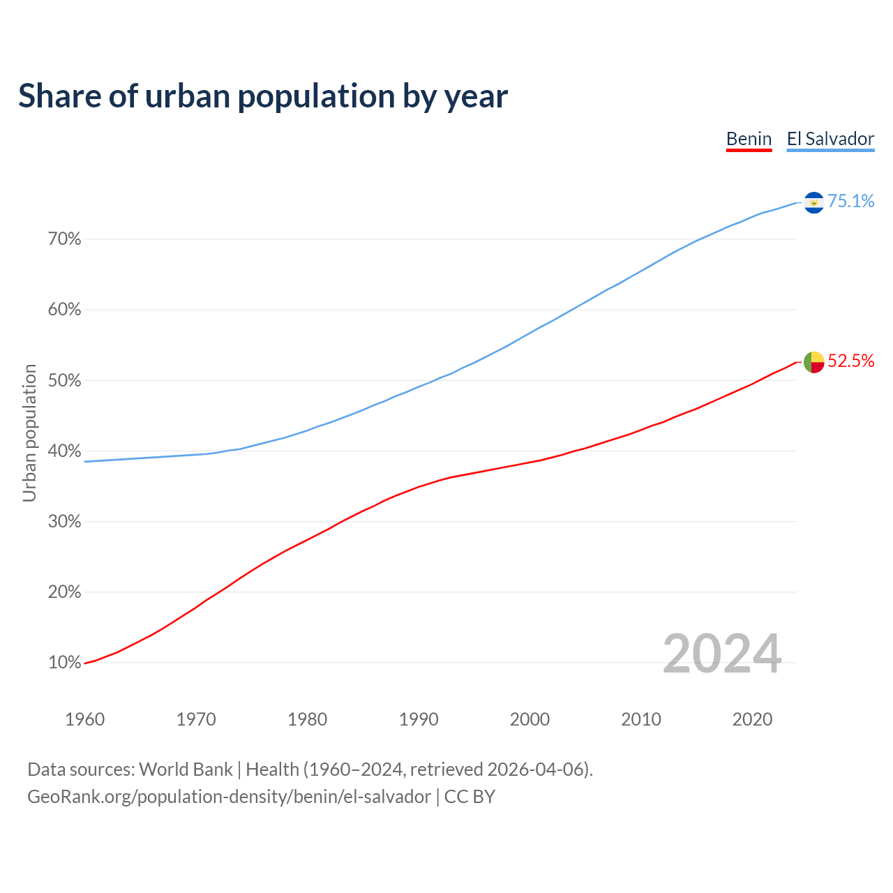From 2004 to 2024, the share of urban population changed from 39.9% to 52.5% in Benin and from 60.1% to 75.1% in El Salvador.
