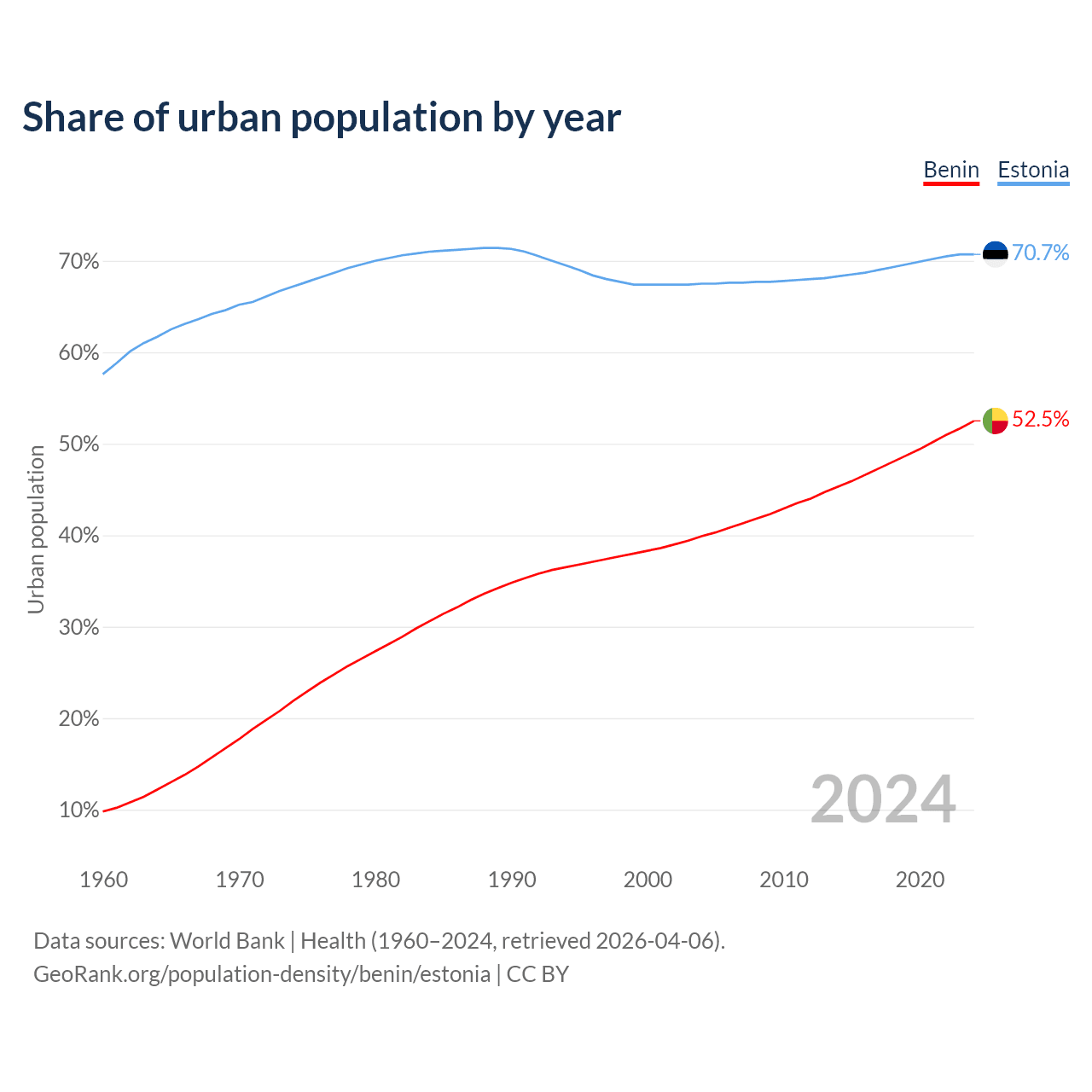 From 2004 to 2024, the share of urban population changed from 39.9% to 52.5% in Benin and from 67.5% to 70.7% in Estonia.