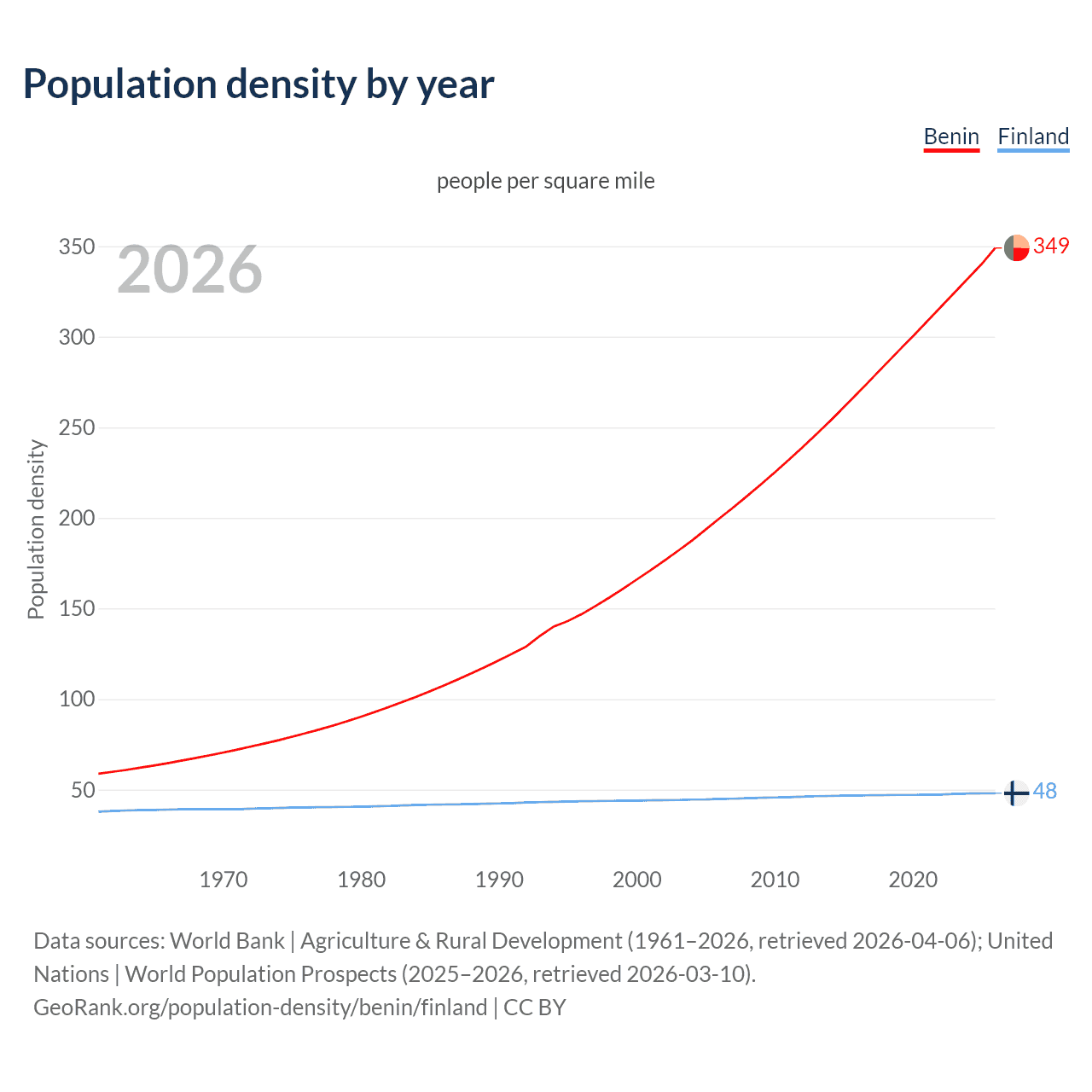 From 2006 to 2026, population density in Benin increased by 74.6%, compared to a 7% growth in Finland.