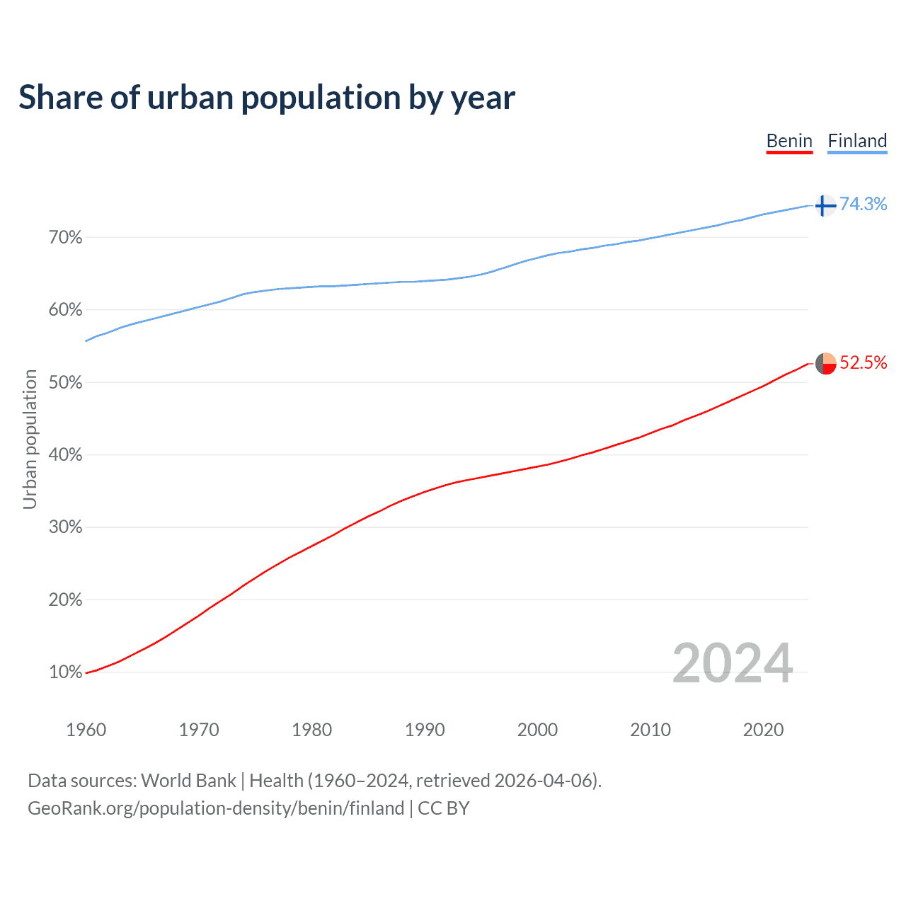 From 2004 to 2024, the share of urban population changed from 39.9% to 52.5% in Benin and from 68.3% to 74.3% in Finland.