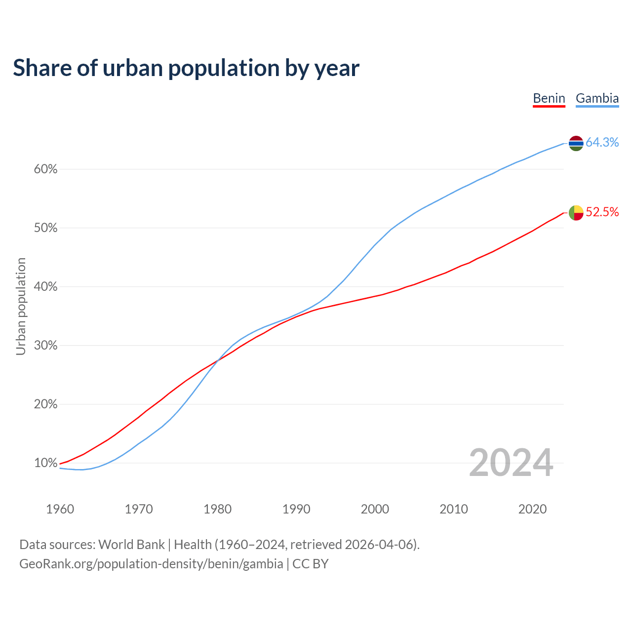 From 2004 to 2024, the share of urban population changed from 39.9% to 52.5% in Benin and from 51.5% to 64.3% in the Gambia.