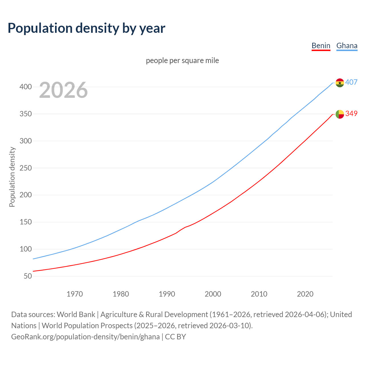 From 2006 to 2026, population density in Benin increased by 74.6%, compared to a 55% growth in Ghana.