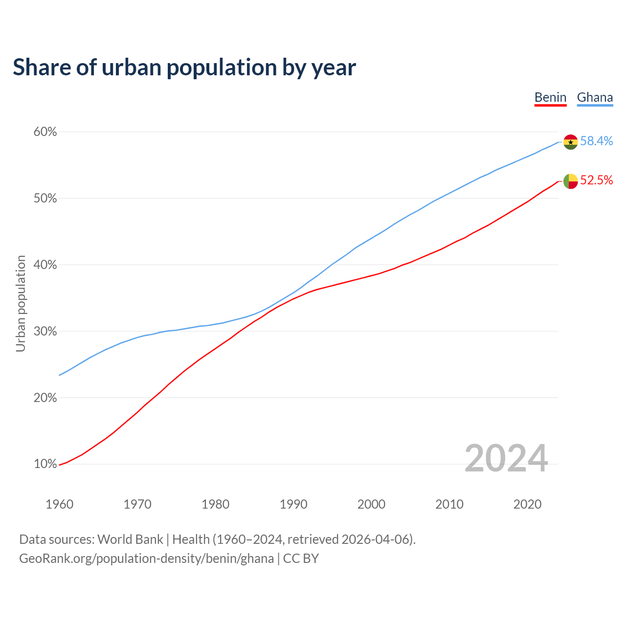 From 2004 to 2024, the share of urban population changed from 39.9% to 52.5% in Benin and from 46.8% to 58.4% in Ghana.