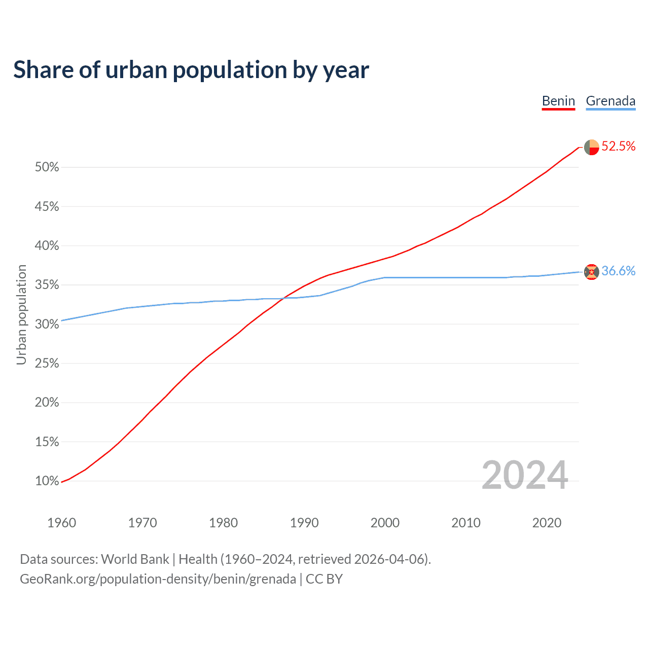 From 2004 to 2024, the share of urban population changed from 39.9% to 52.5% in Benin and from 35.9% to 36.6% in Grenada.
