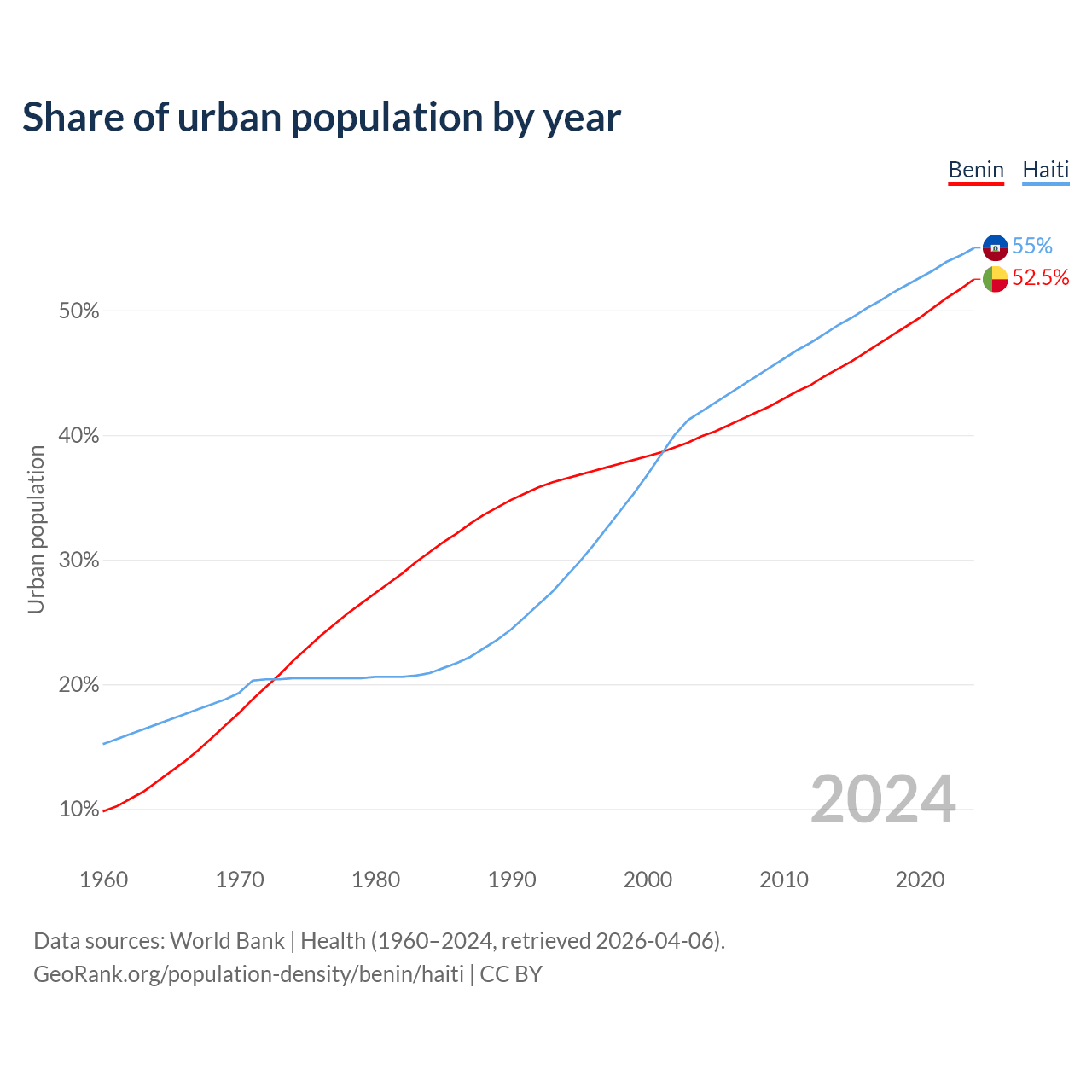 From 2004 to 2024, the share of urban population changed from 39.9% to 52.5% in Benin and from 41.9% to 55% in Haiti.