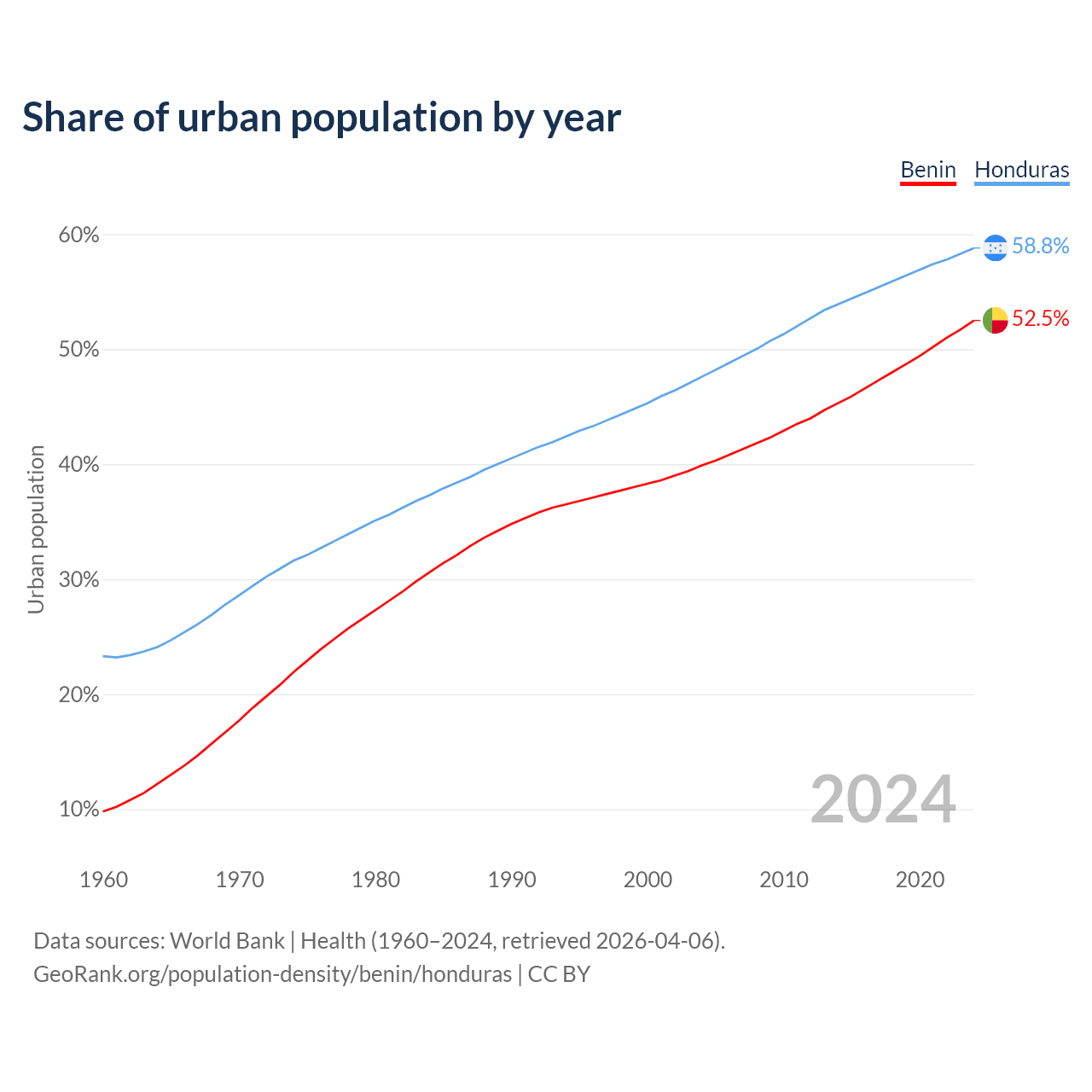 From 2004 to 2024, the share of urban population changed from 39.9% to 52.5% in Benin and from 47.6% to 58.8% in Honduras.