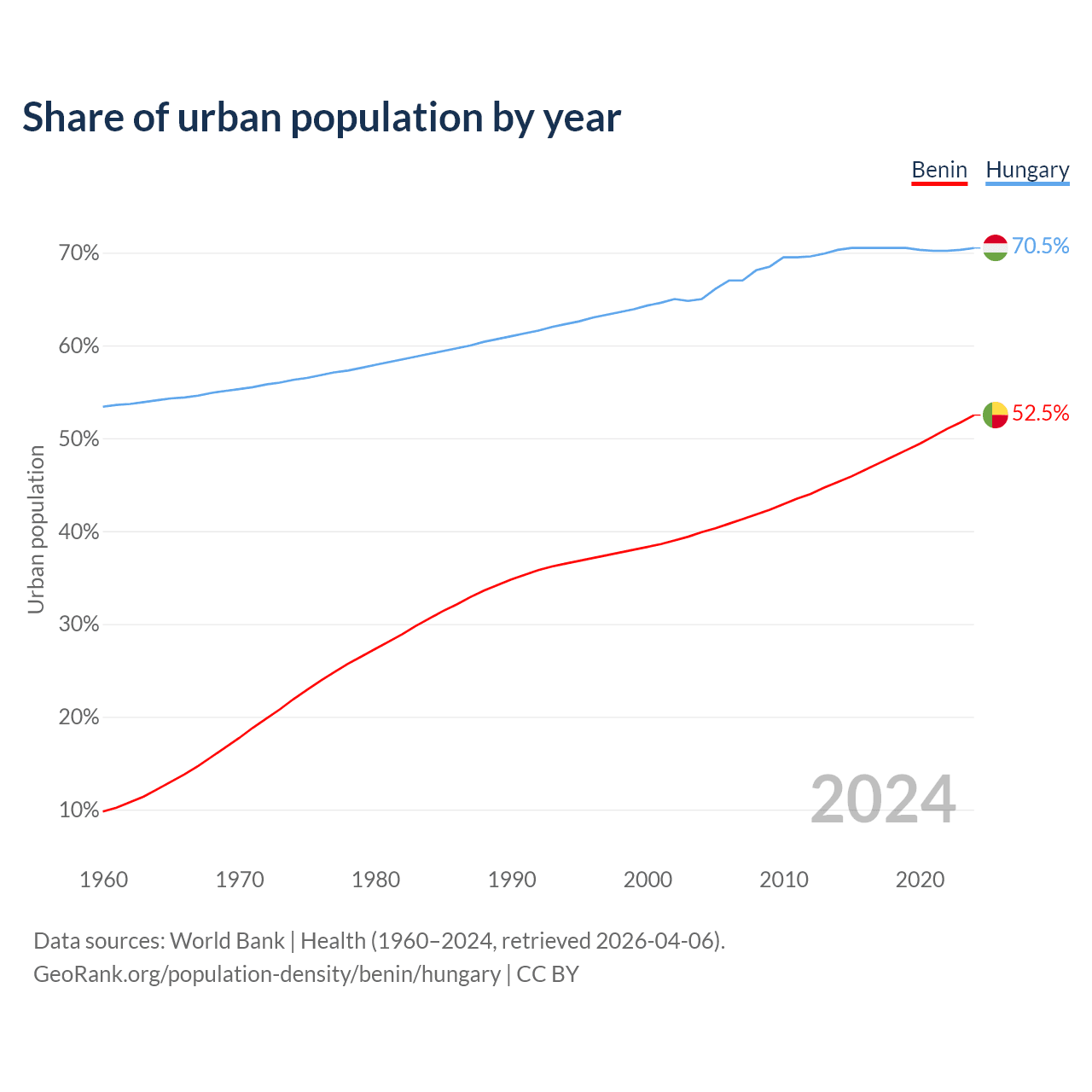 From 2006 to 2026, population density in Benin increased by 74.6%, compared to a 7.62% decline in Hungary.