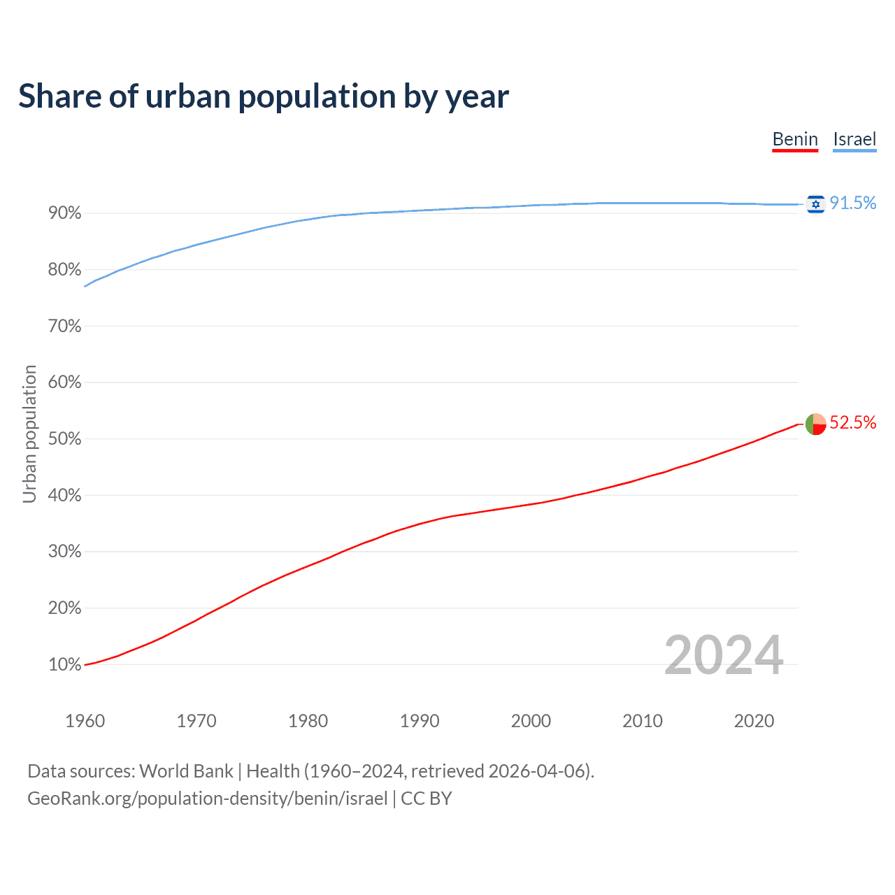 From 2004 to 2024, the share of urban population changed from 39.9% to 52.5% in Benin and from 91.6% to 91.5% in Israel.