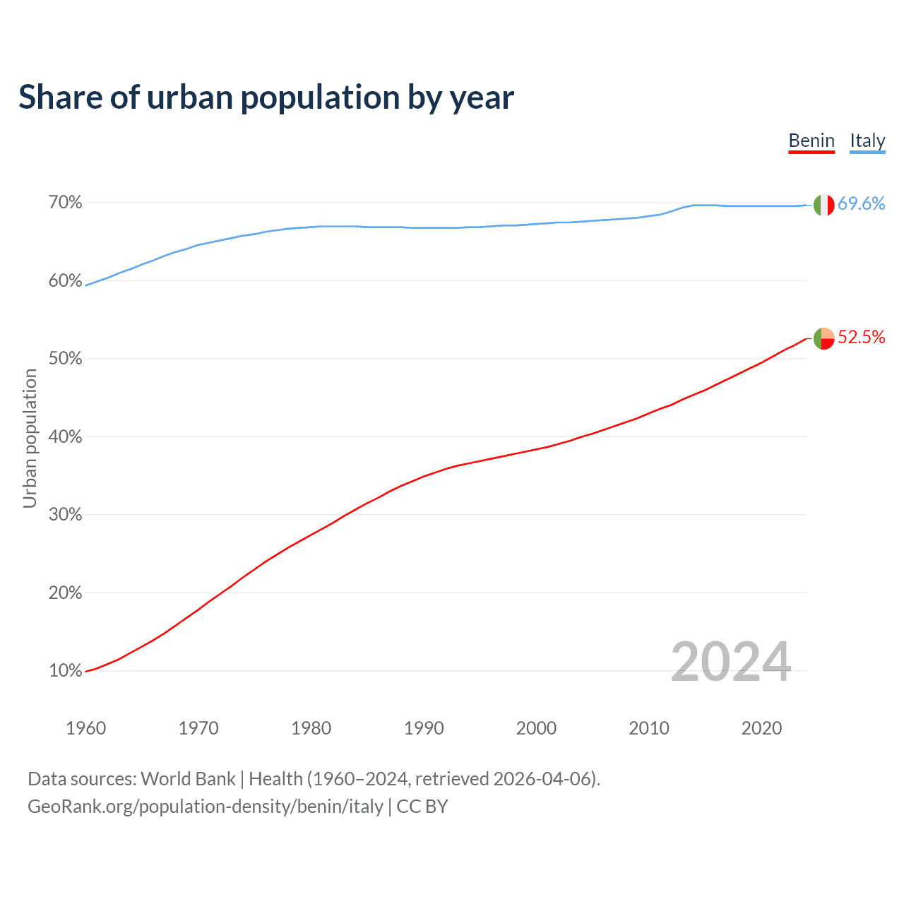 From 2004 to 2024, the share of urban population changed from 39.9% to 52.5% in Benin and from 67.5% to 69.6% in Italy.