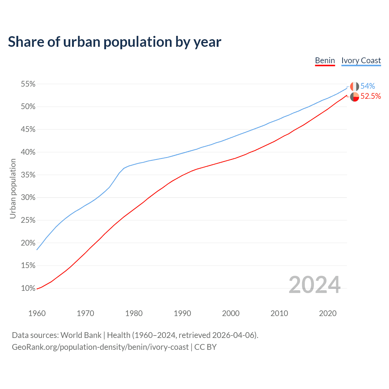 From 2004 to 2024, the share of urban population changed from 39.9% to 52.5% in Benin and from 44.7% to 54% in Ivory Coast.