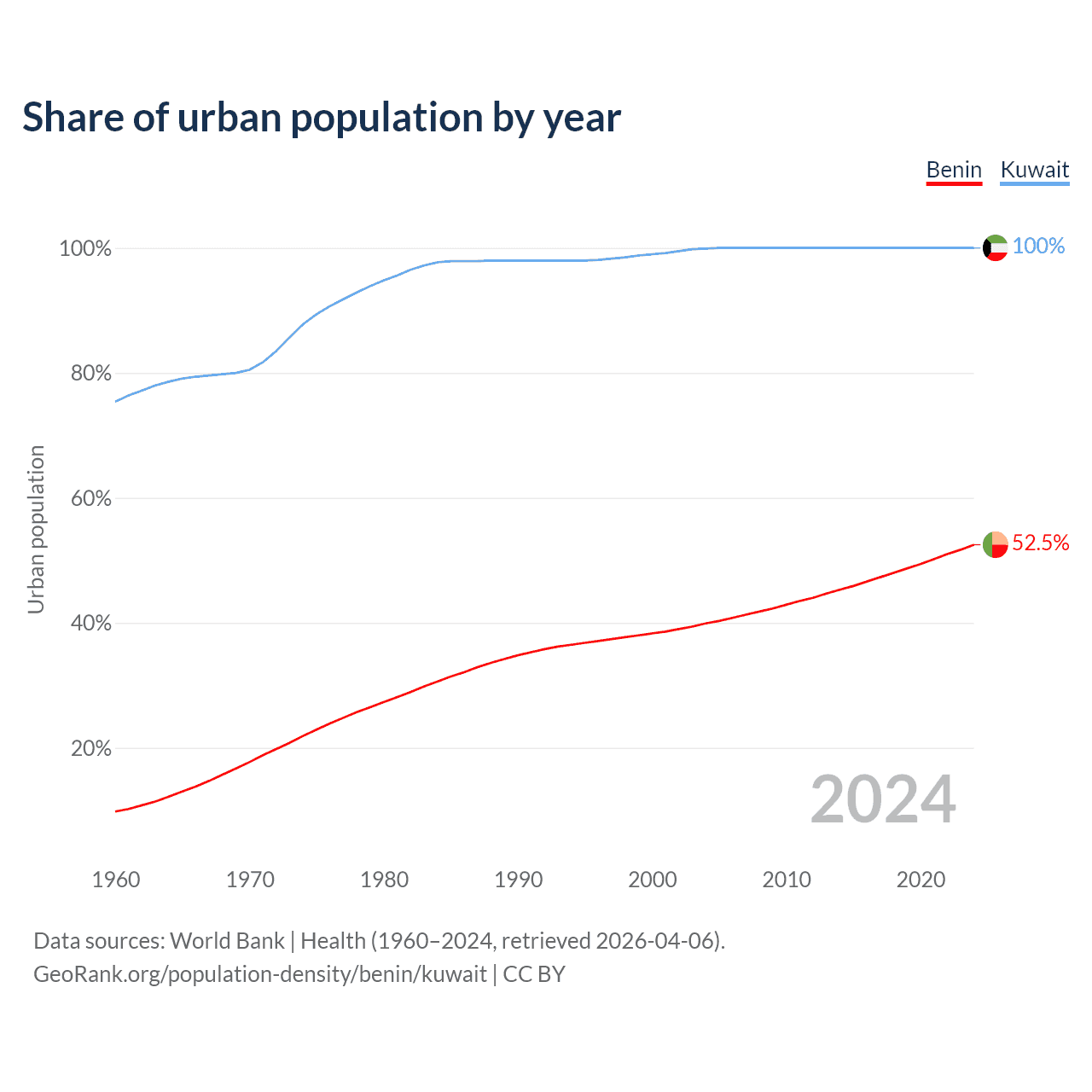 From 2004 to 2024, the share of urban population changed from 39.9% to 52.5% in Benin and from 99.9% to 100% in Kuwait.