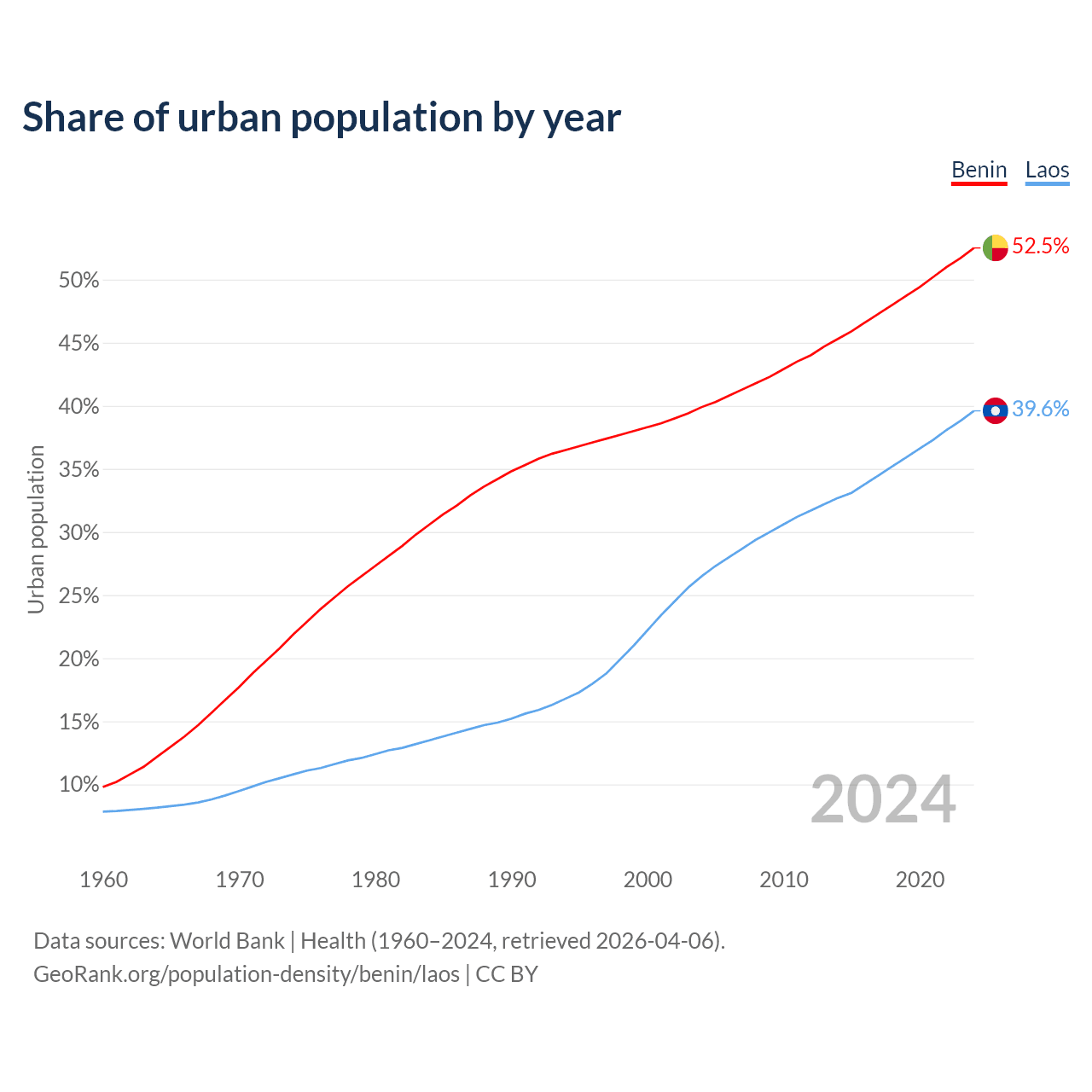 From 2004 to 2024, the share of urban population changed from 39.9% to 52.5% in Benin and from 26.5% to 39.6% in Laos.