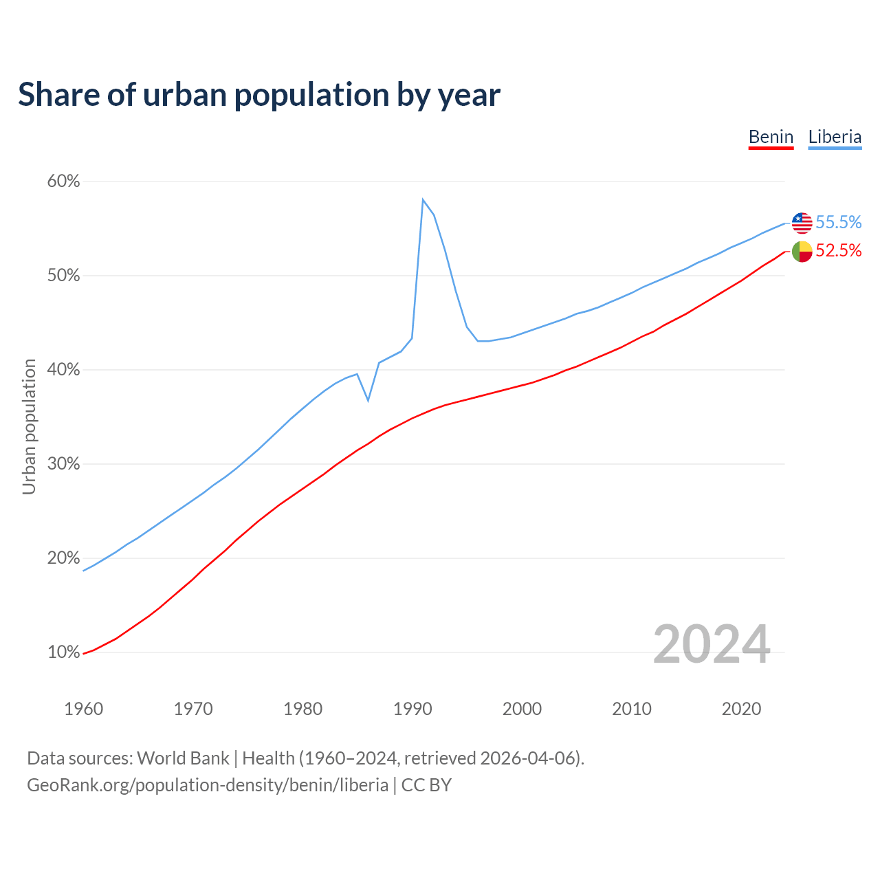 From 2004 to 2024, the share of urban population changed from 39.9% to 52.5% in Benin and from 45.4% to 55.5% in Liberia.