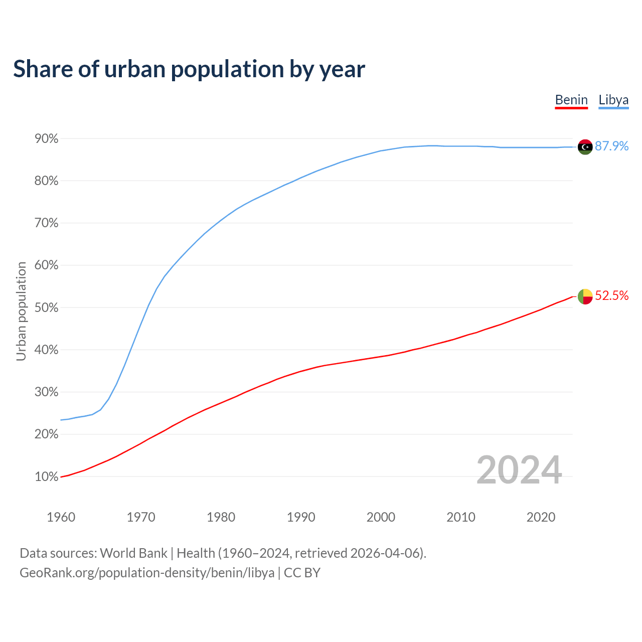 From 2004 to 2024, the share of urban population changed from 39.9% to 52.5% in Benin and from 88% to 87.9% in Libya.