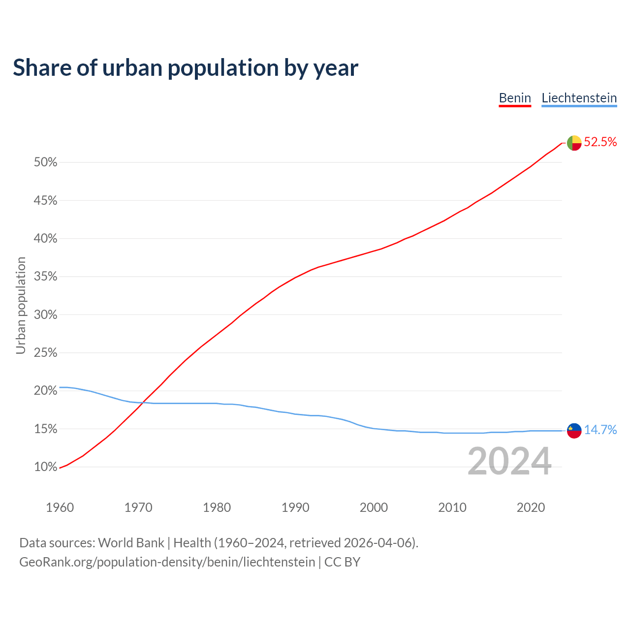 From 2004 to 2024, the share of urban population changed from 39.9% to 52.5% in Benin and from 14.7% to 14.7% in Liechtenstein.