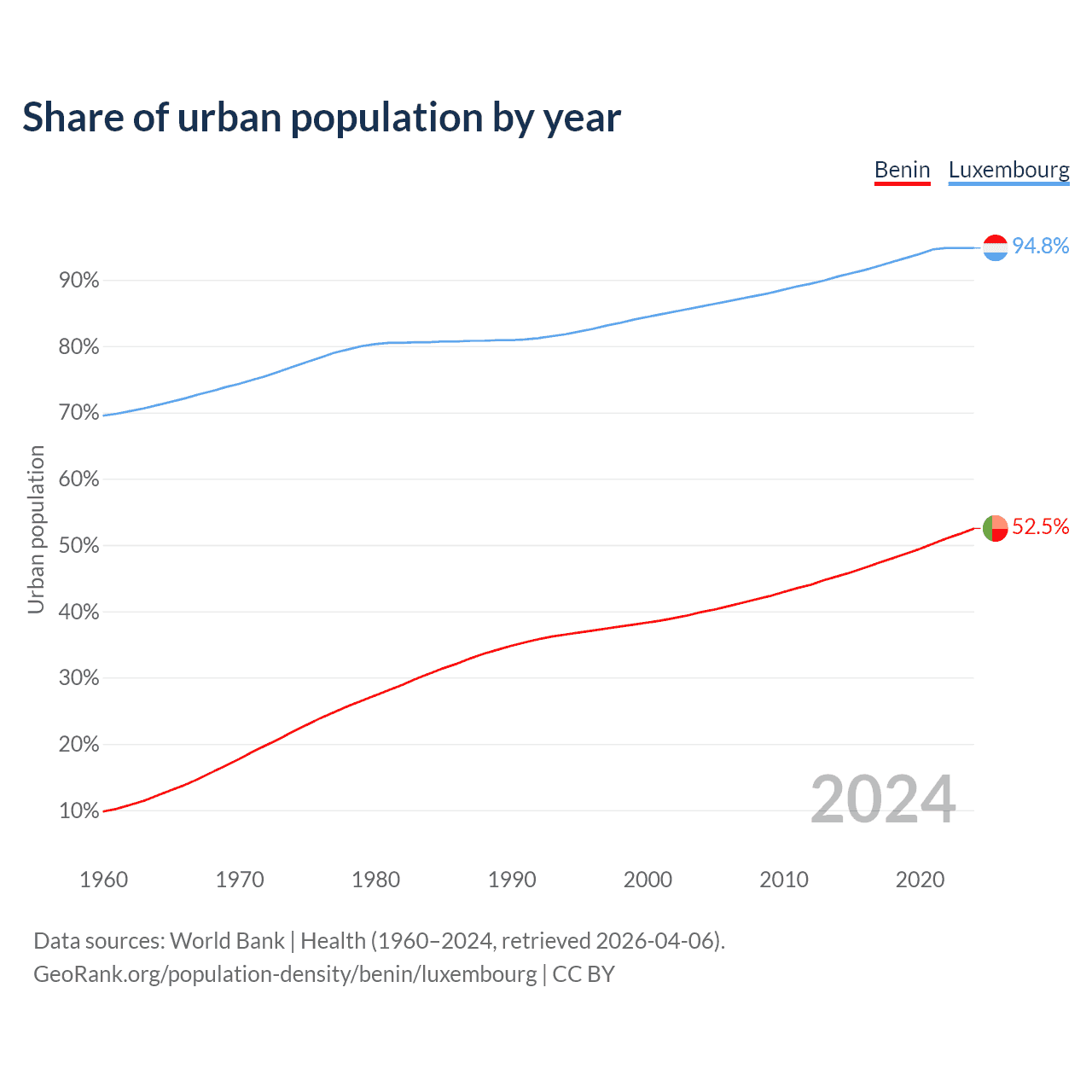 From 2004 to 2024, the share of urban population changed from 39.9% to 52.5% in Benin and from 86% to 94.8% in Luxembourg.