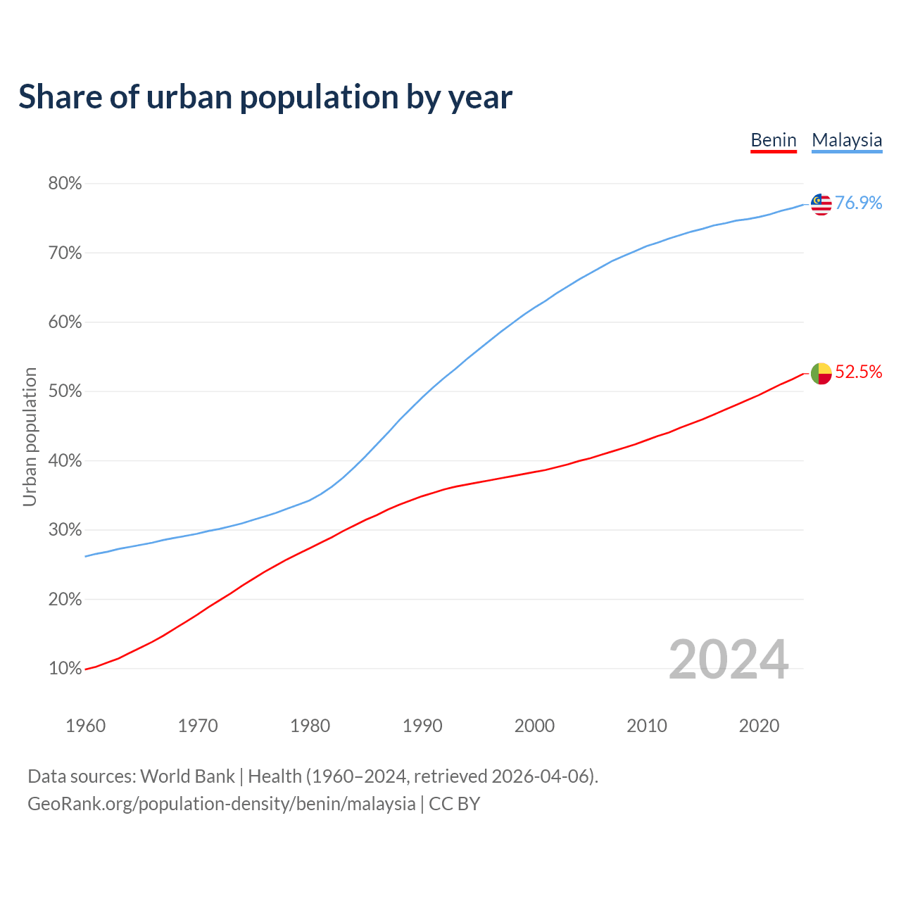 From 2004 to 2024, the share of urban population changed from 39.9% to 52.5% in Benin and from 66.1% to 76.9% in Malaysia.