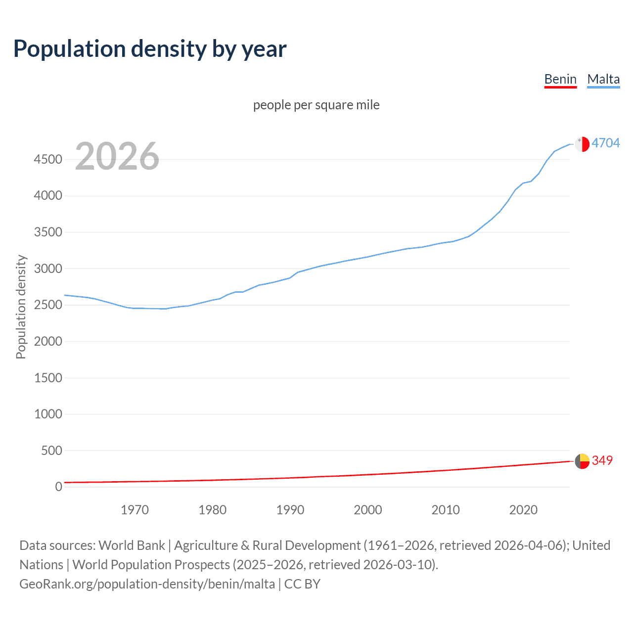 From 2006 to 2026, population density in Benin increased by 74.6%, compared to a 43.4% growth in Malta.