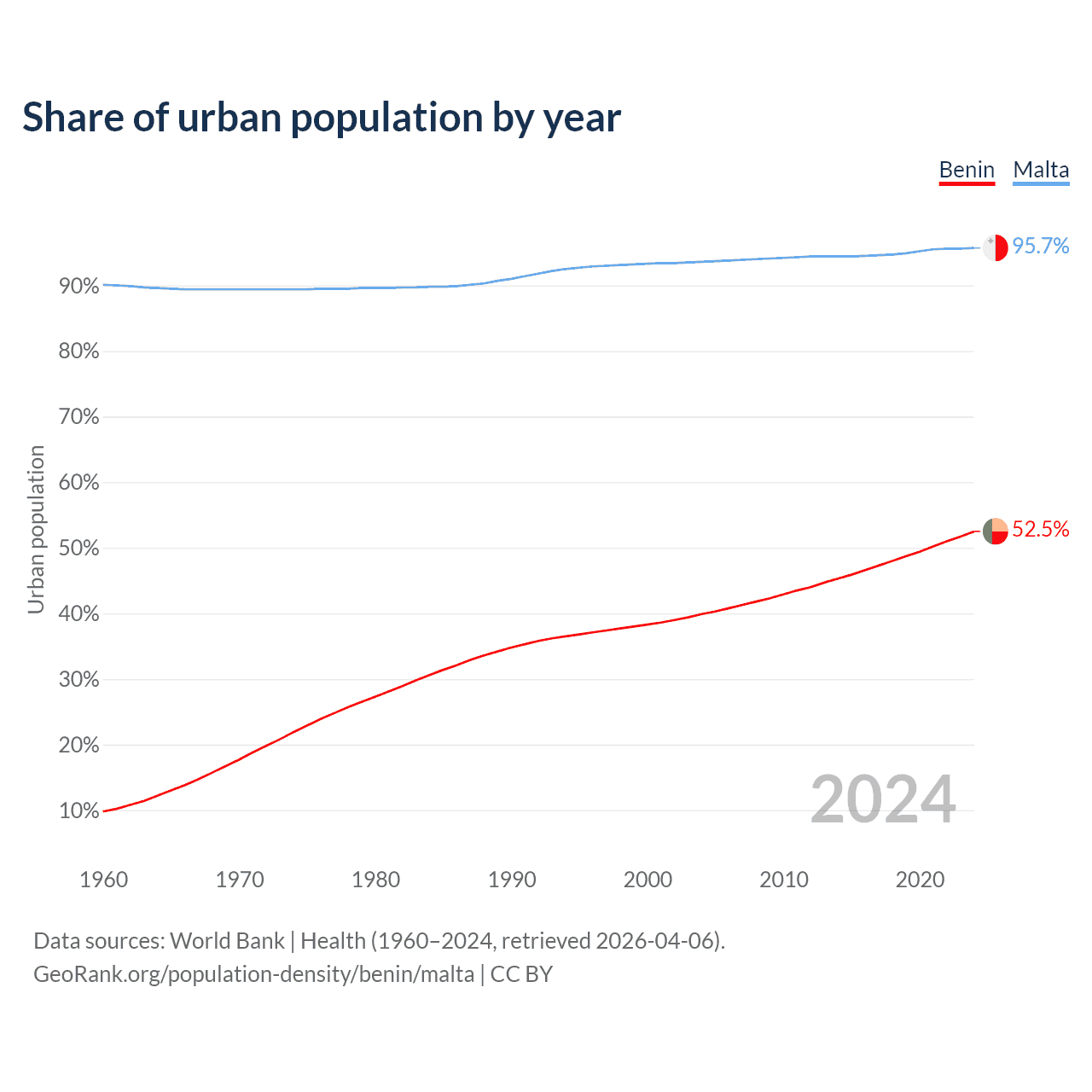 From 2004 to 2024, the share of urban population changed from 39.9% to 52.5% in Benin and from 93.6% to 95.7% in Malta.