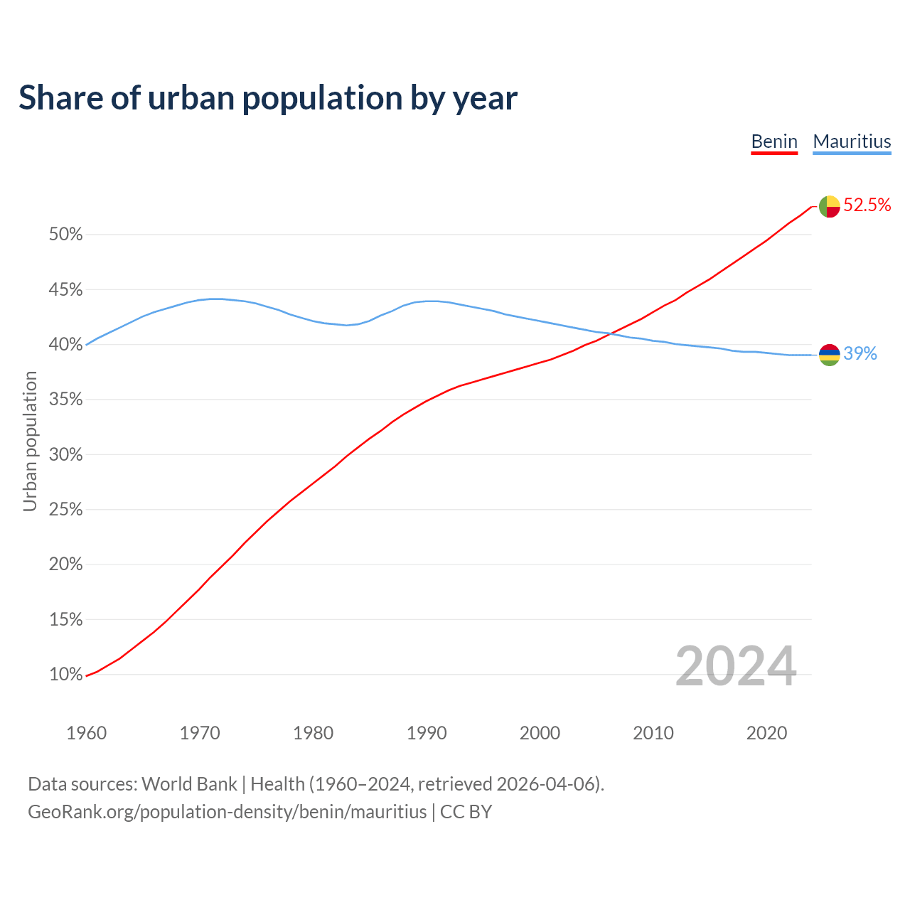 From 2004 to 2024, the share of urban population changed from 39.9% to 52.5% in Benin and from 41.3% to 39% in Mauritius.