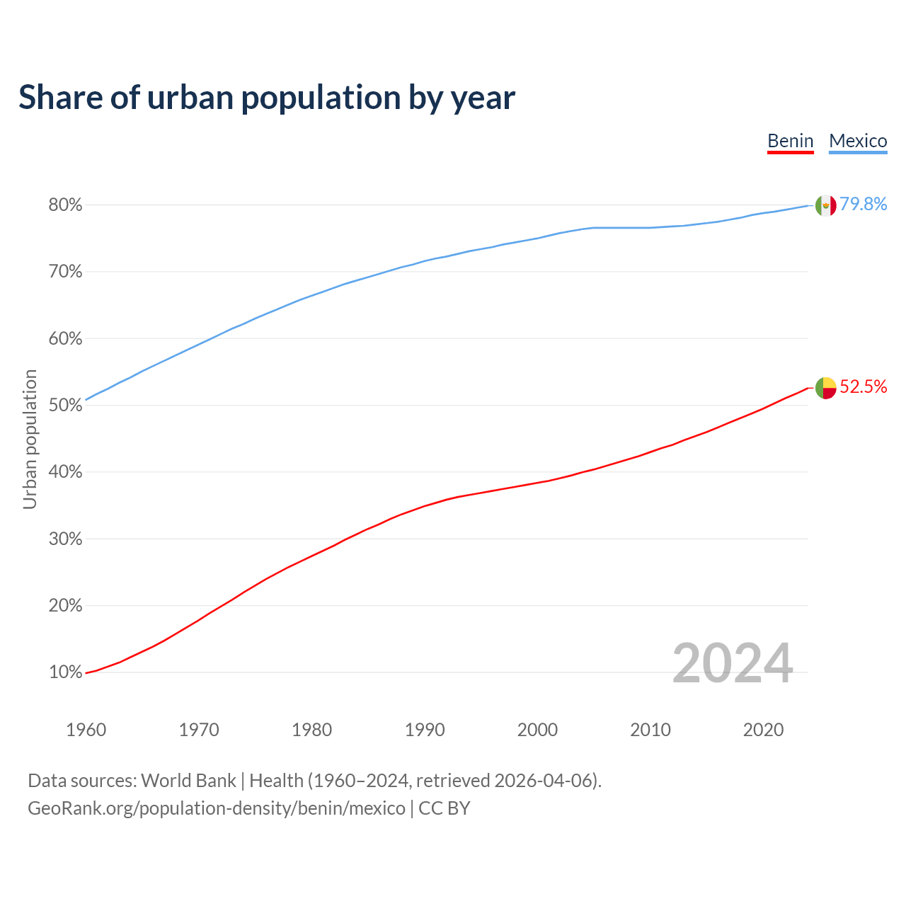 From 2004 to 2024, the share of urban population changed from 39.9% to 52.5% in Benin and from 76.3% to 79.8% in Mexico.