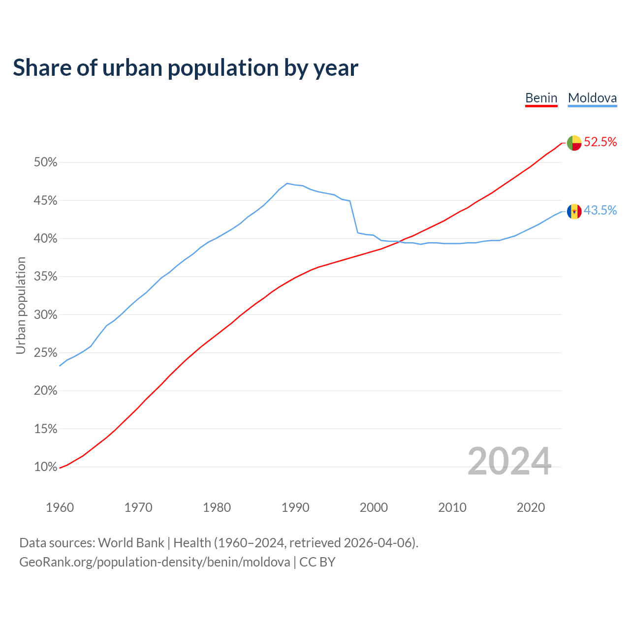 From 2004 to 2024, the share of urban population changed from 39.9% to 52.5% in Benin and from 39.4% to 43.5% in Moldova.