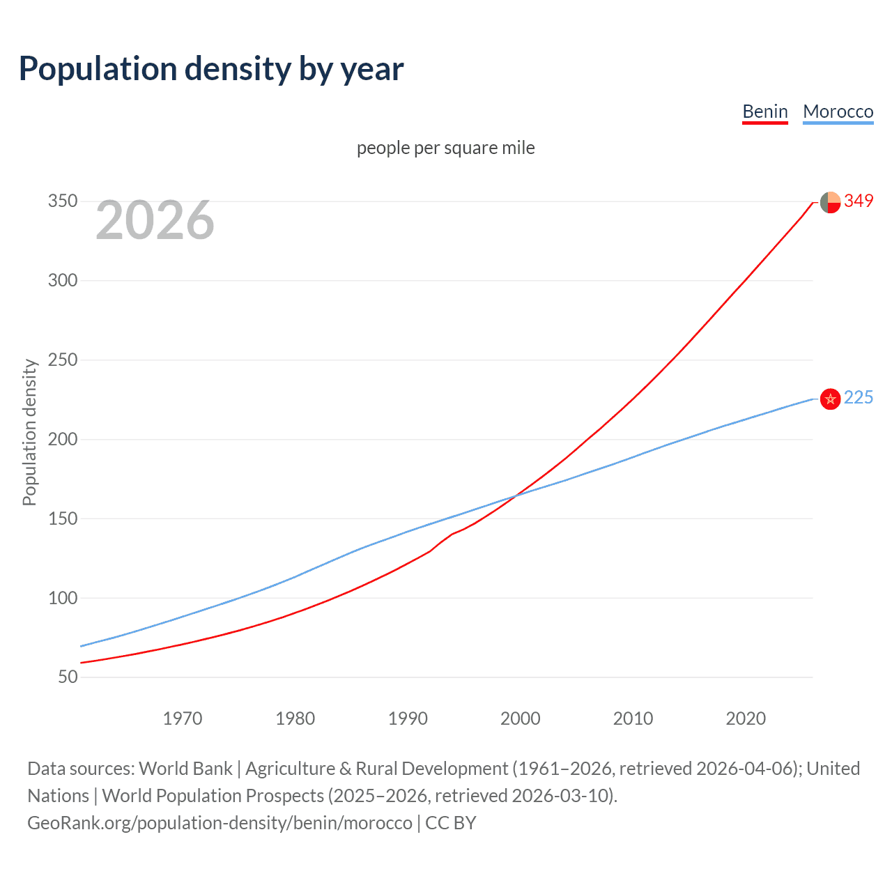 From 2006 to 2026, population density in Benin increased by 74.6%, compared to a 26% growth in Morocco.