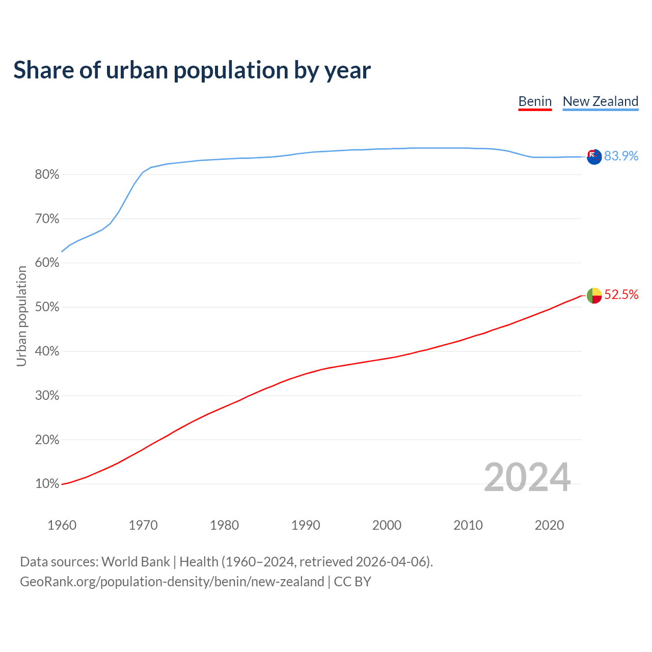 From 2004 to 2024, the share of urban population changed from 39.9% to 52.5% in Benin and from 85.9% to 83.9% in New Zealand.
