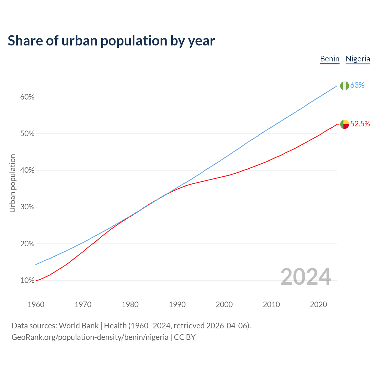 From 2004 to 2024, the share of urban population changed from 39.9% to 52.5% in Benin and from 46.7% to 63% in Nigeria.