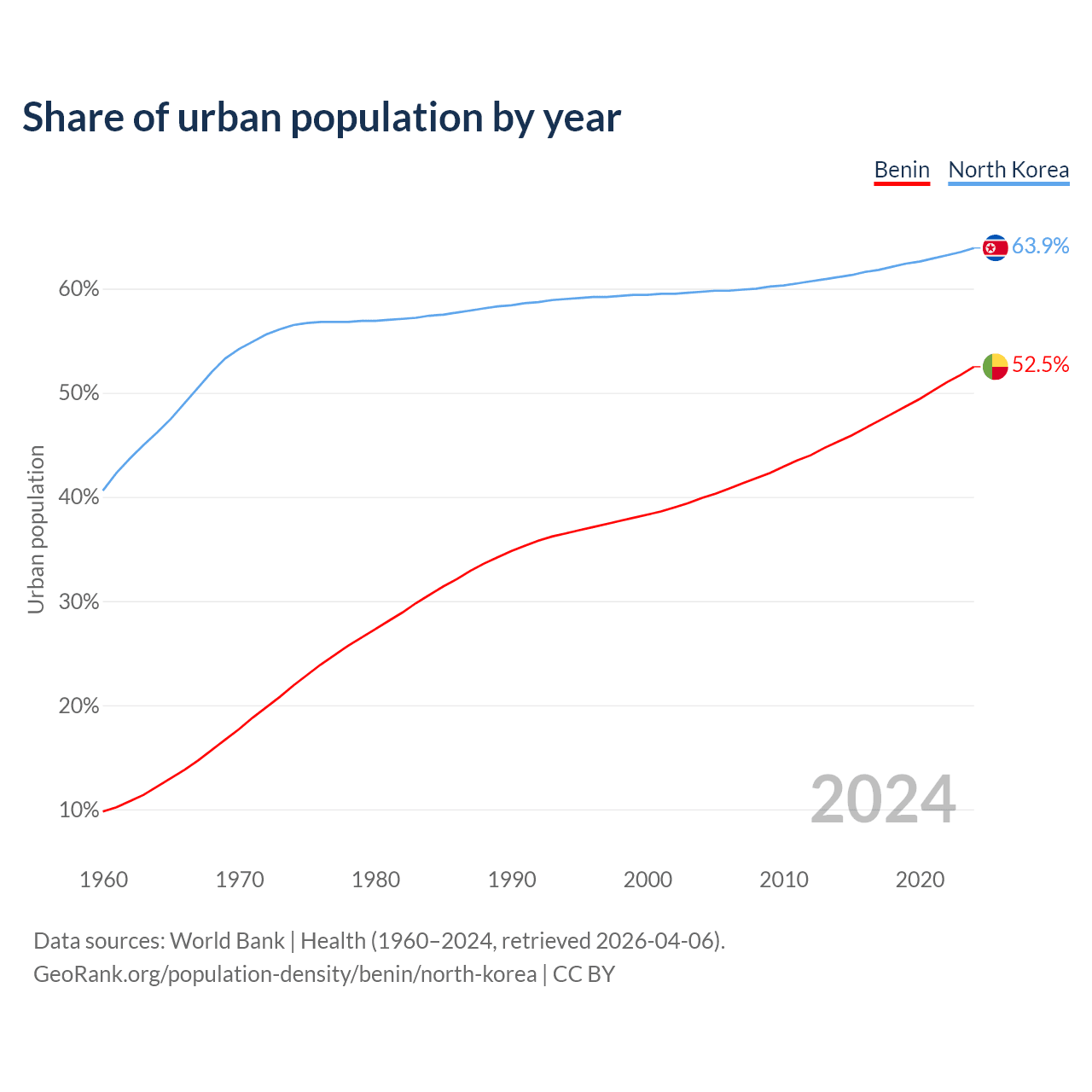 From 2004 to 2024, the share of urban population changed from 39.9% to 52.5% in Benin and from 59.7% to 63.9% in North Korea.
