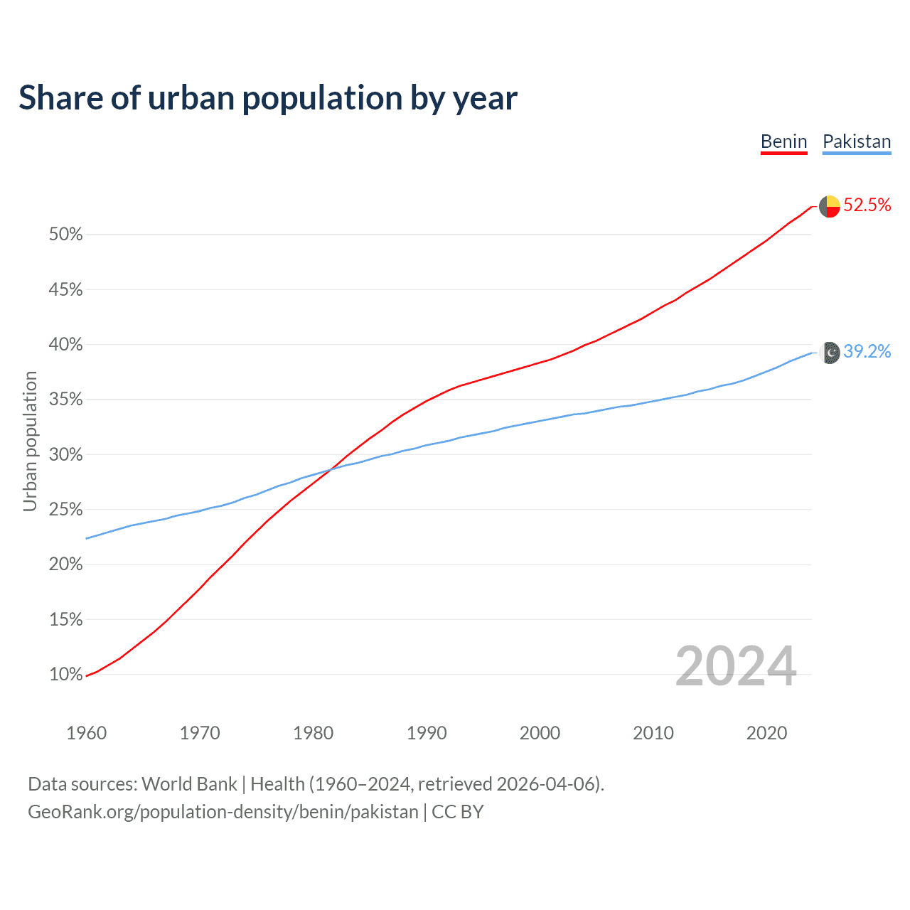 From 2004 to 2024, the share of urban population changed from 39.9% to 52.5% in Benin and from 33.7% to 39.2% in Pakistan.
