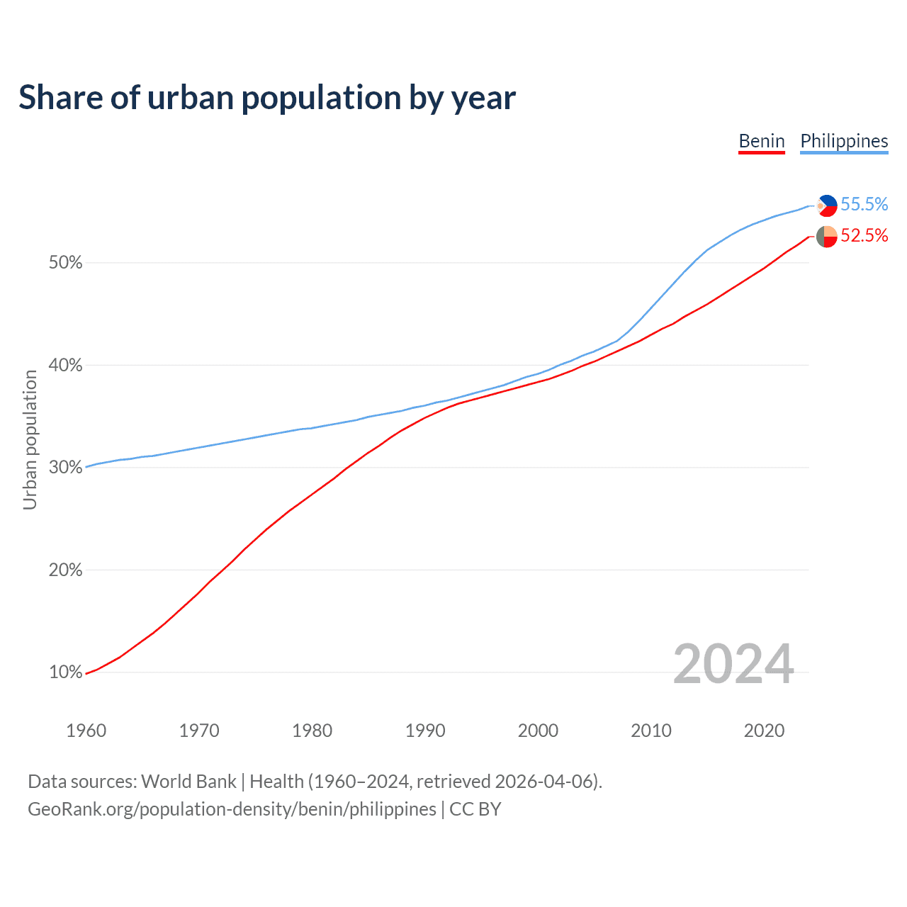 From 2004 to 2024, the share of urban population changed from 39.9% to 52.5% in Benin and from 40.9% to 55.5% in the Philippines.