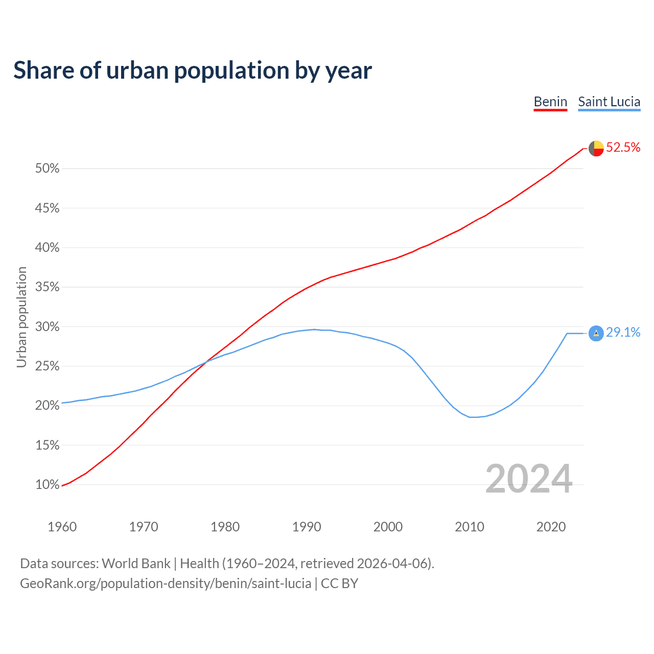 From 2004 to 2024, the share of urban population changed from 39.9% to 52.5% in Benin and from 24.8% to 29.1% in Saint Lucia.