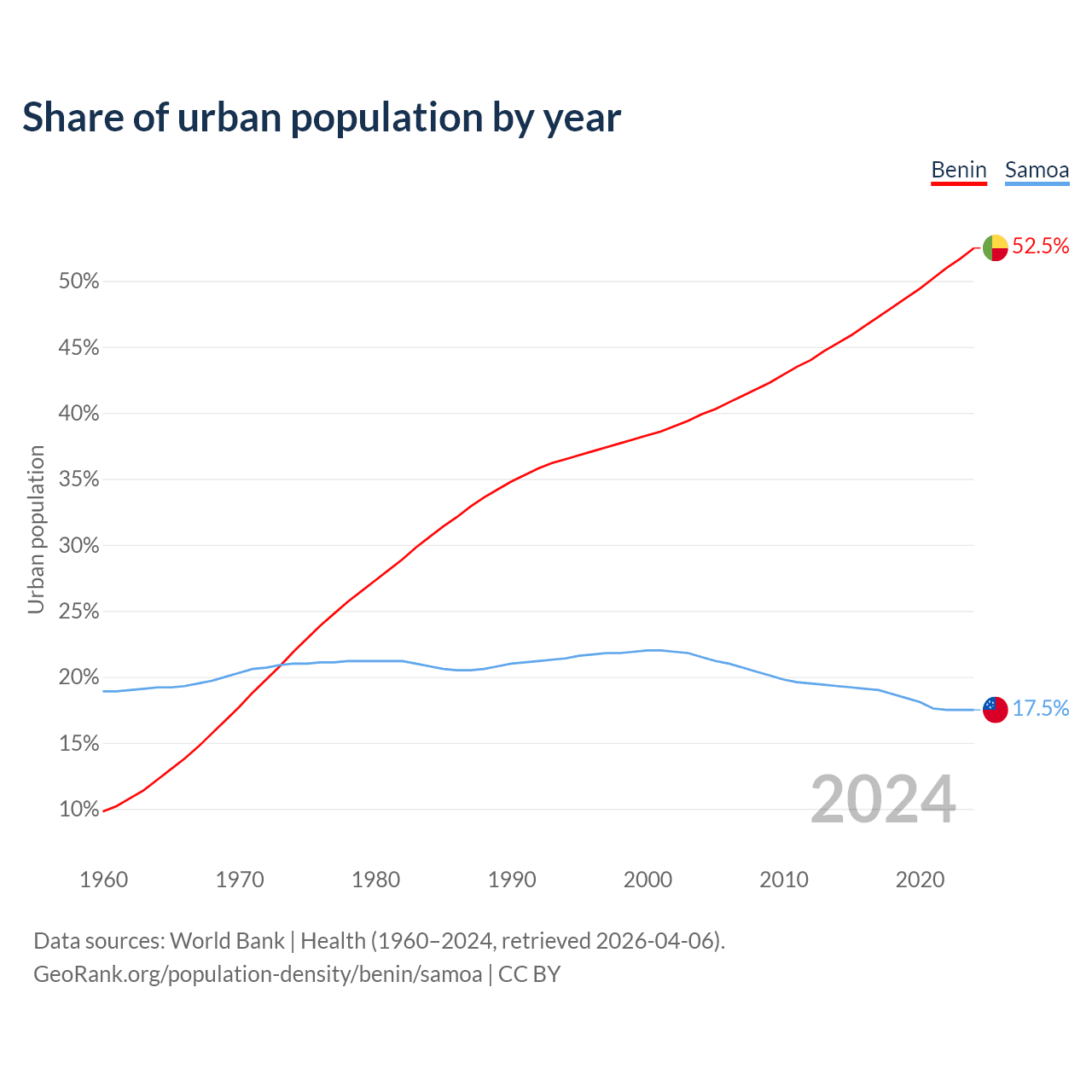 From 2004 to 2024, the share of urban population changed from 39.9% to 52.5% in Benin and from 21.5% to 17.5% in Samoa.