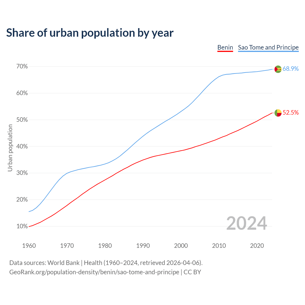From 2004 to 2024, the share of urban population changed from 39.9% to 52.5% in Benin and from 57.9% to 68.9% in Sao Tome and Principe.