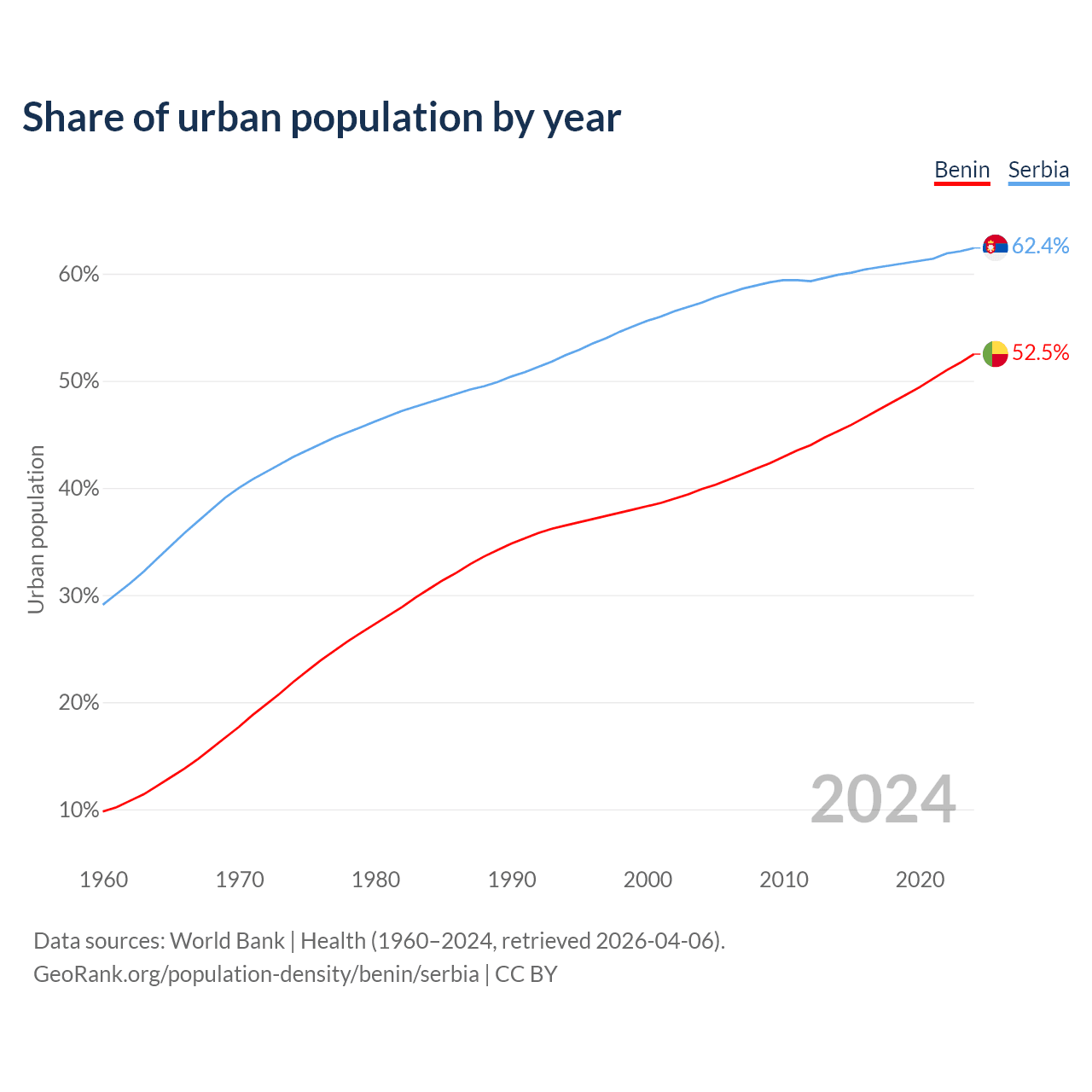From 2004 to 2024, the share of urban population changed from 39.9% to 52.5% in Benin and from 57.3% to 62.4% in Serbia.