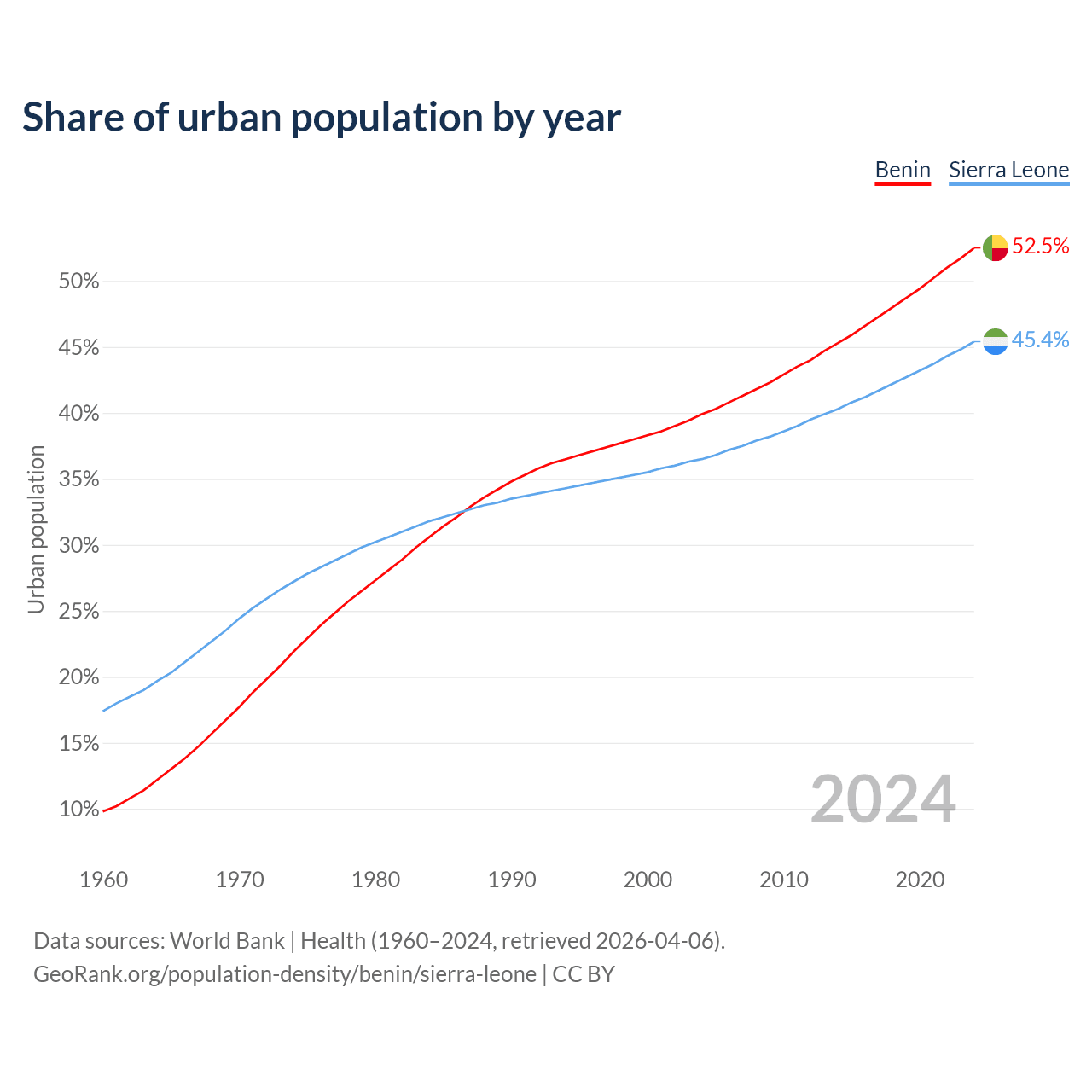 From 2004 to 2024, the share of urban population changed from 39.9% to 52.5% in Benin and from 36.5% to 45.4% in Sierra Leone.