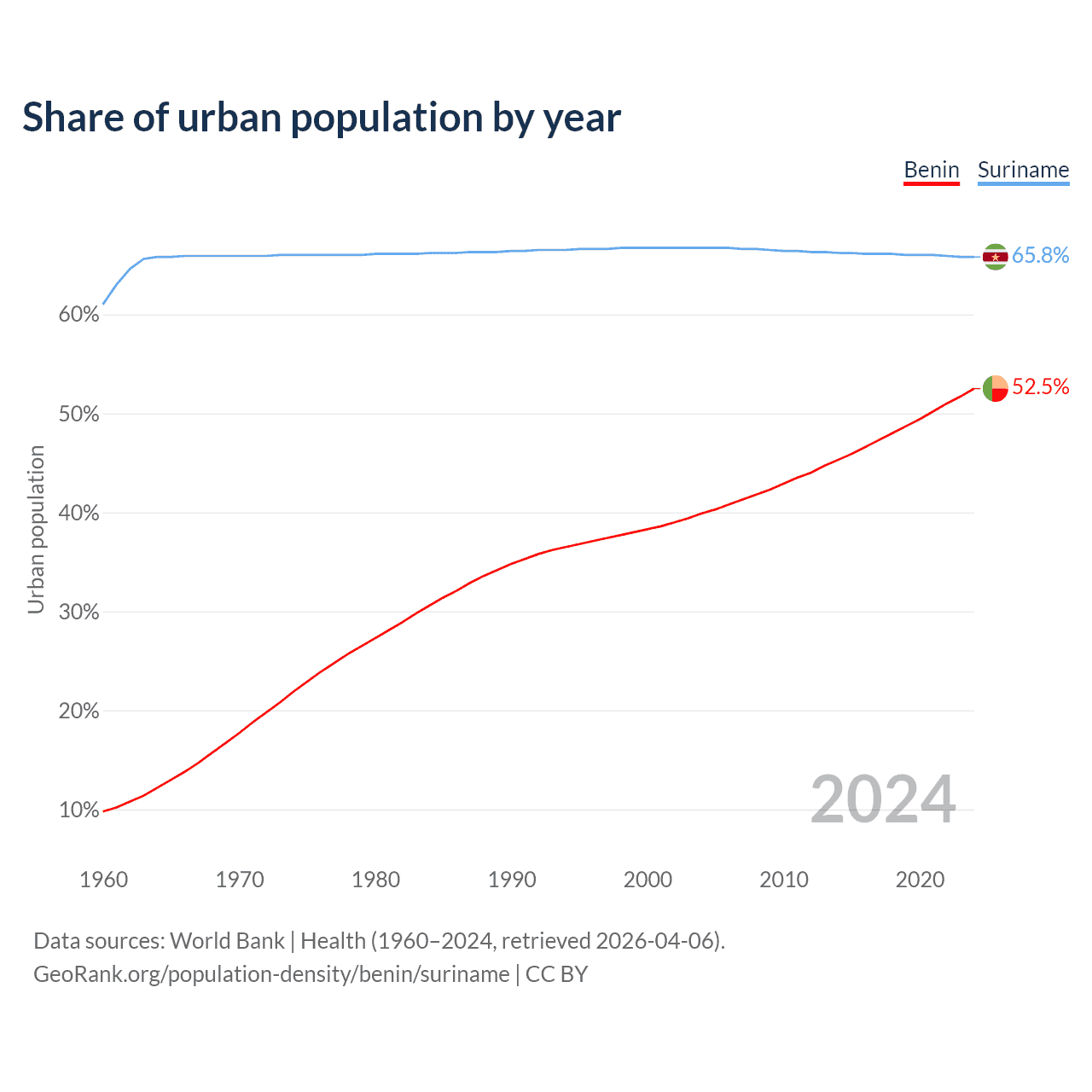 From 2004 to 2024, the share of urban population changed from 39.9% to 52.5% in Benin and from 66.7% to 65.8% in Suriname.
