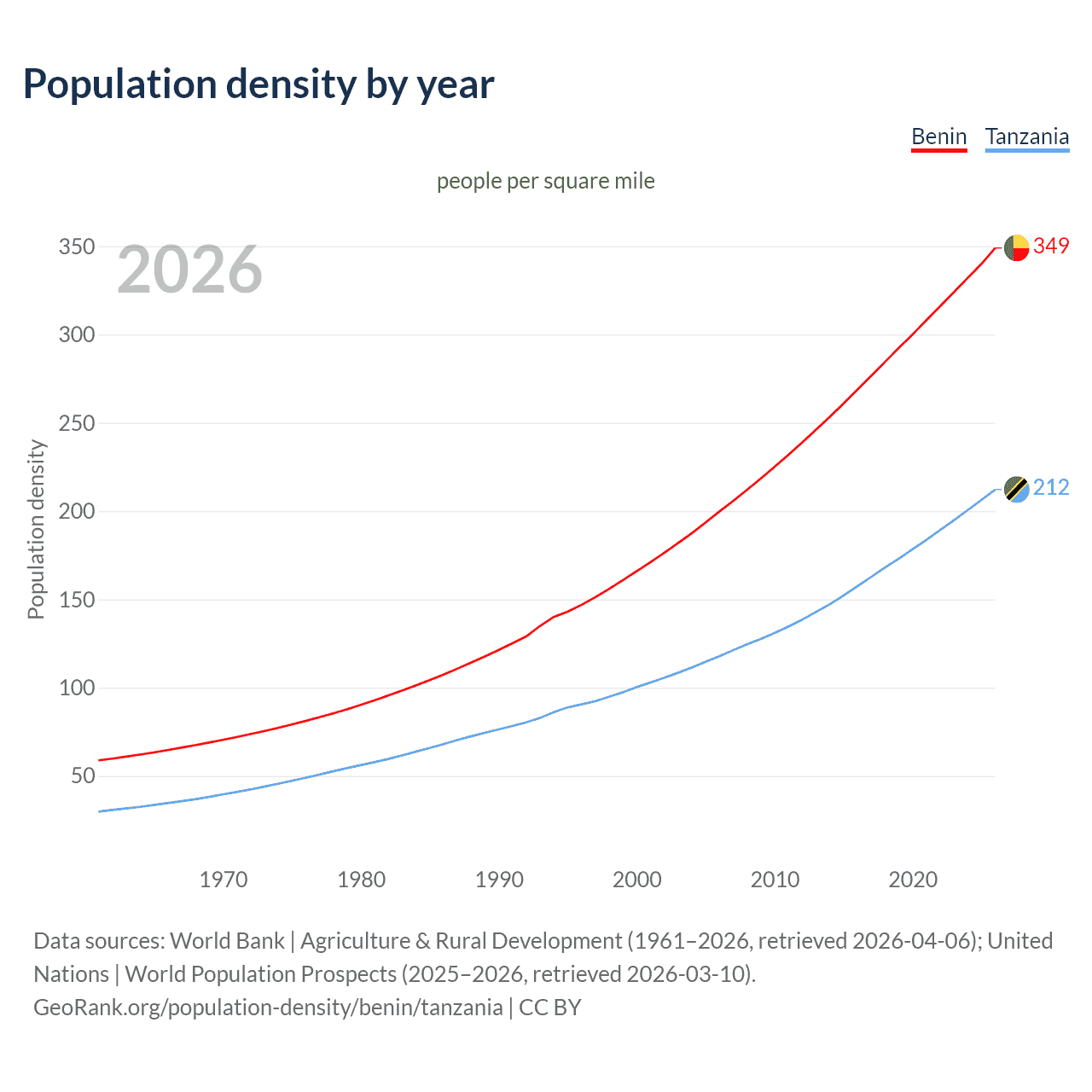From 2006 to 2026, population density in Benin increased by 74.6%, compared to a 80.1% growth in Tanzania.