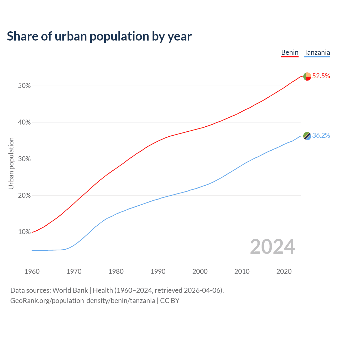 From 2004 to 2024, the share of urban population changed from 39.9% to 52.5% in Benin and from 24.1% to 36.2% in Tanzania.