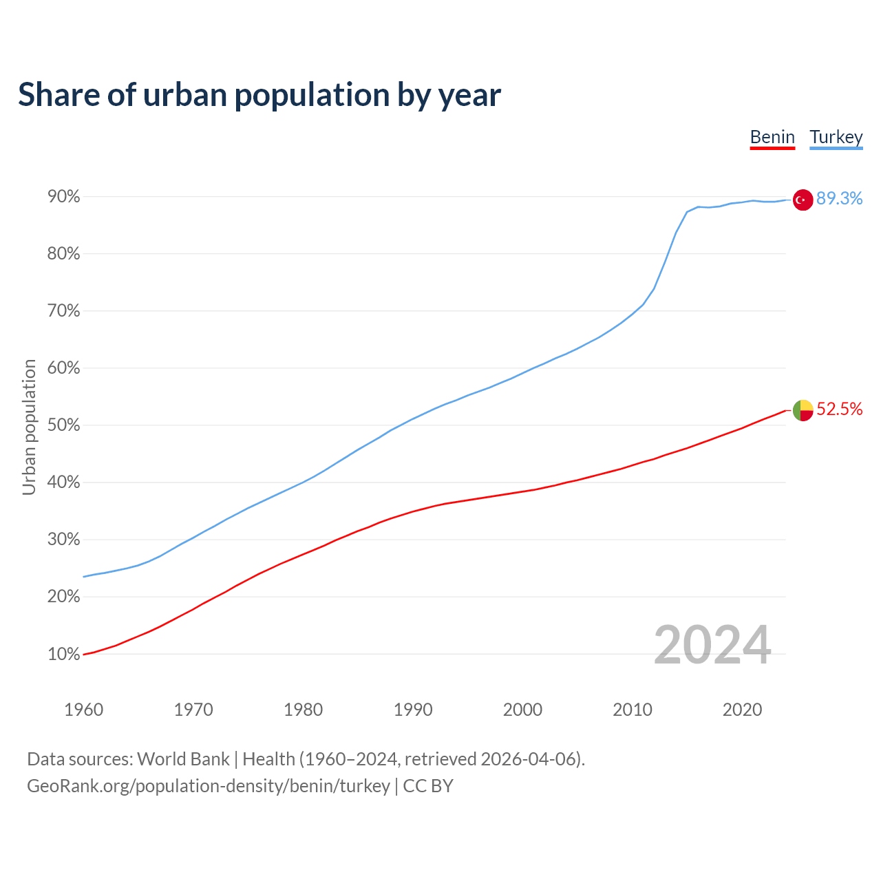 From 2004 to 2024, the share of urban population changed from 39.9% to 52.5% in Benin and from 62.4% to 89.3% in Turkey.