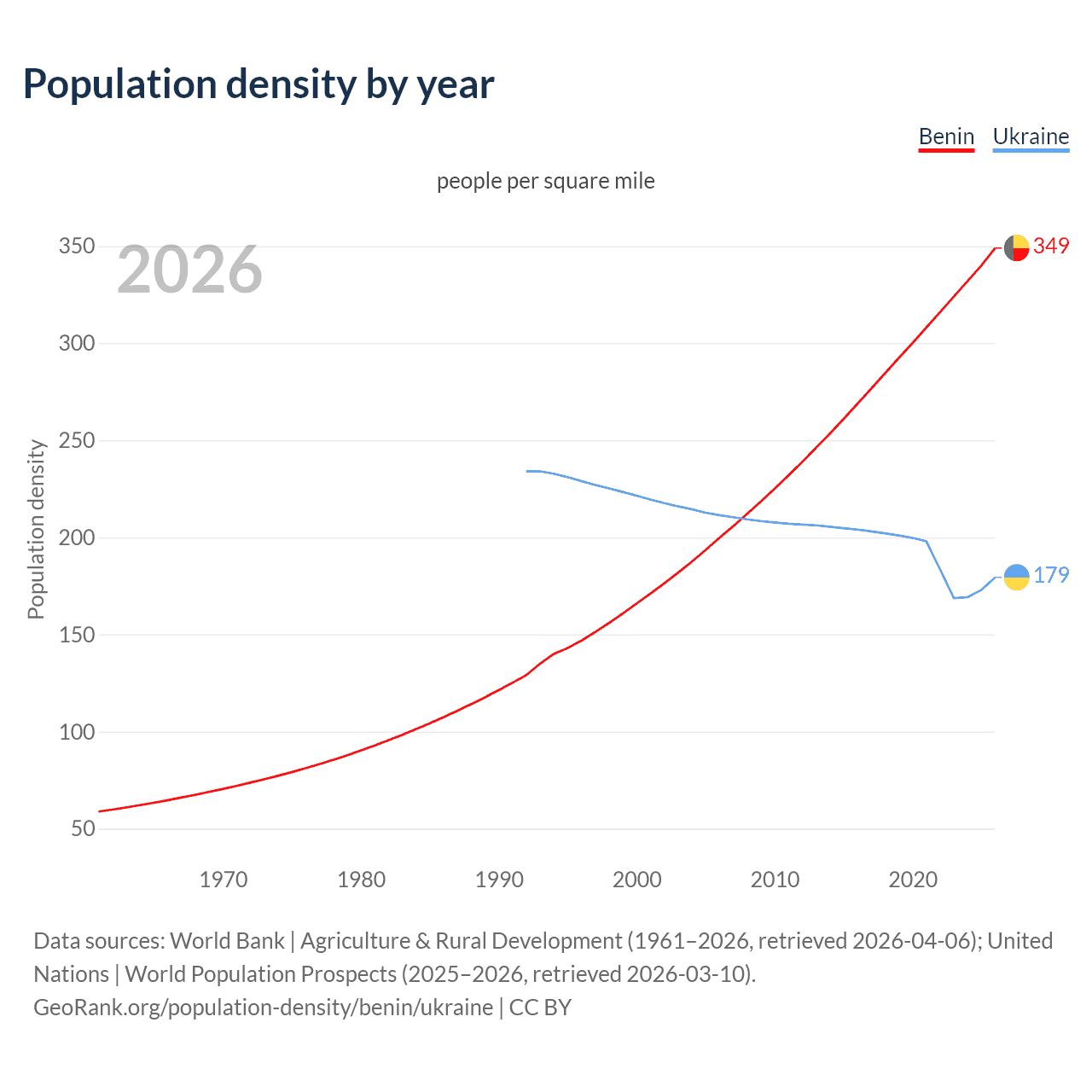 From 2006 to 2026, population density in Benin increased by 74.6%, compared to a 15.1% decline in Ukraine.