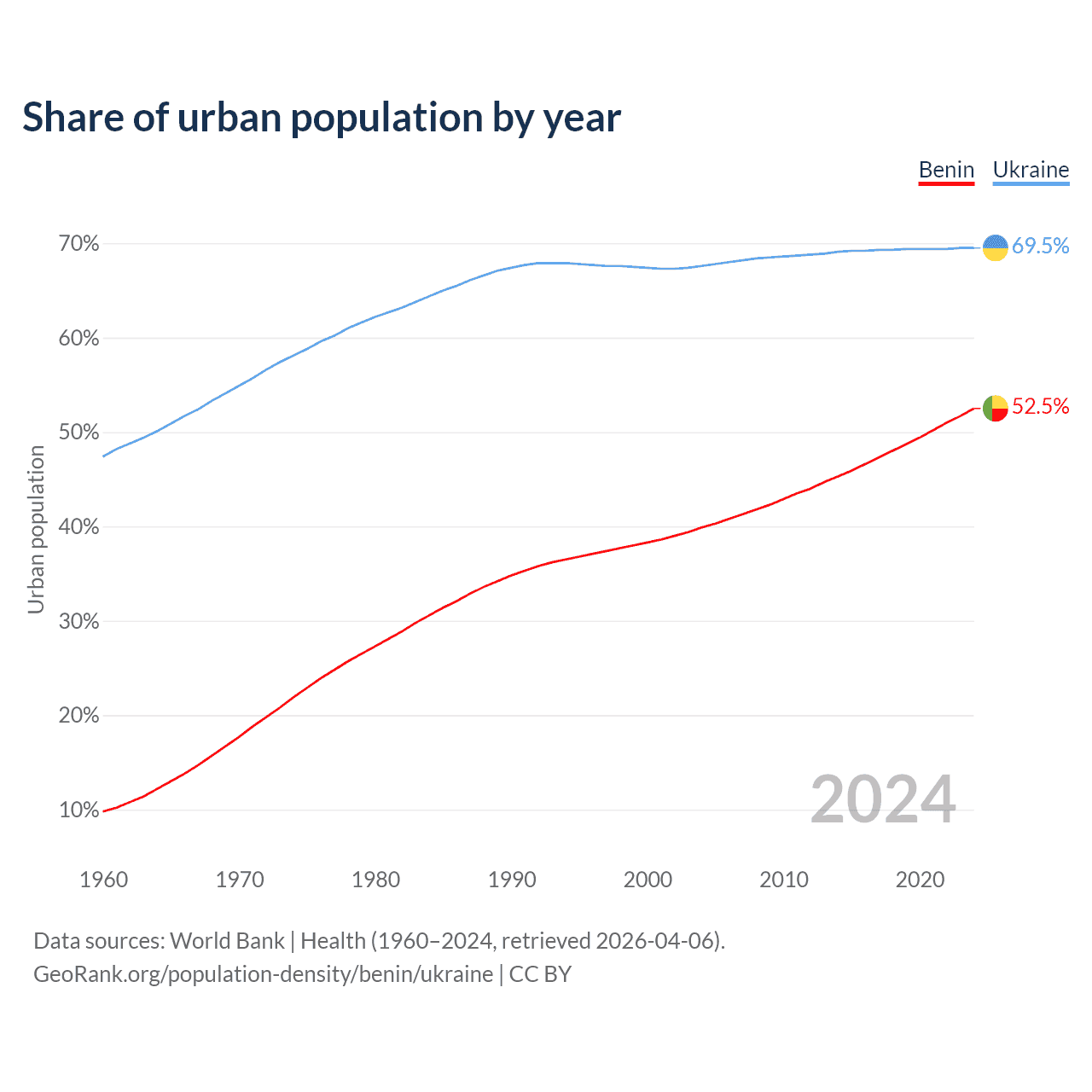 From 2004 to 2024, the share of urban population changed from 39.9% to 52.5% in Benin and from 67.6% to 69.5% in Ukraine.