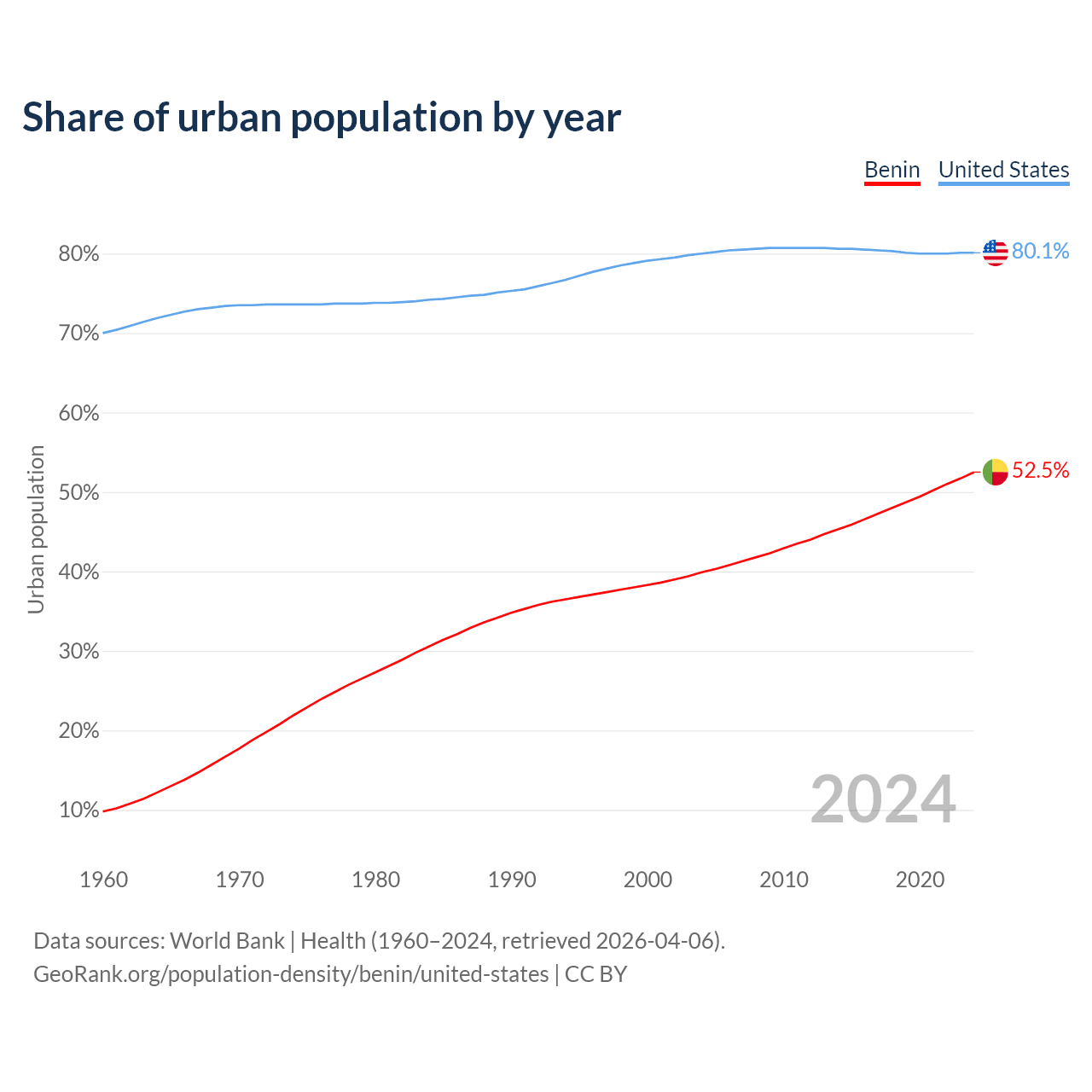 From 2004 to 2024, the share of urban population changed from 39.9% to 52.5% in Benin and from 80% to 80.1% in the United States.