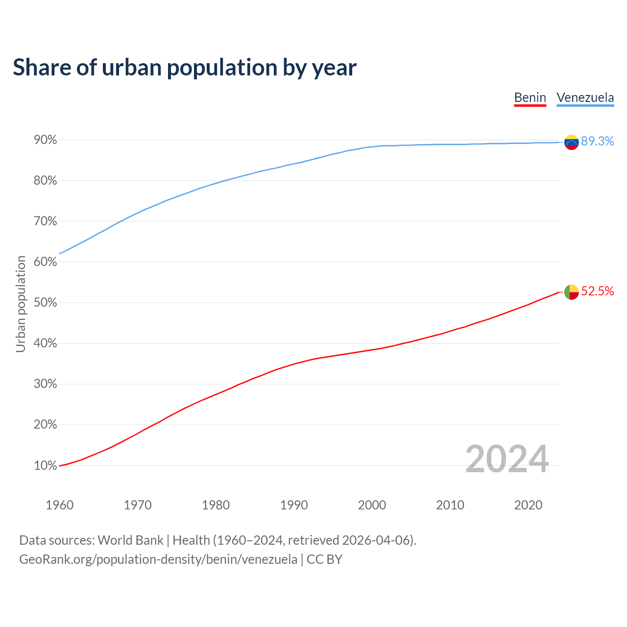 From 2004 to 2024, the share of urban population changed from 39.9% to 52.5% in Benin and from 88.6% to 89.3% in Venezuela.