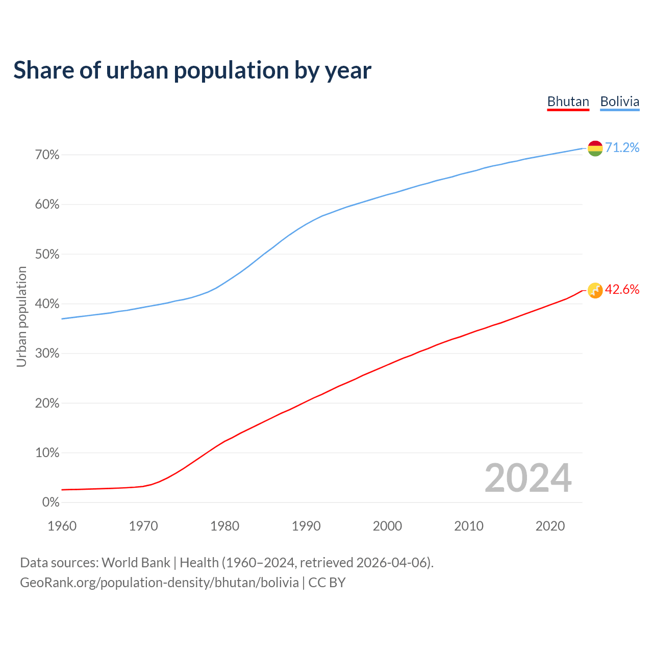 From 2004 to 2024, the share of urban population changed from 30.3% to 42.6% in Bhutan and from 63.8% to 71.2% in Bolivia.