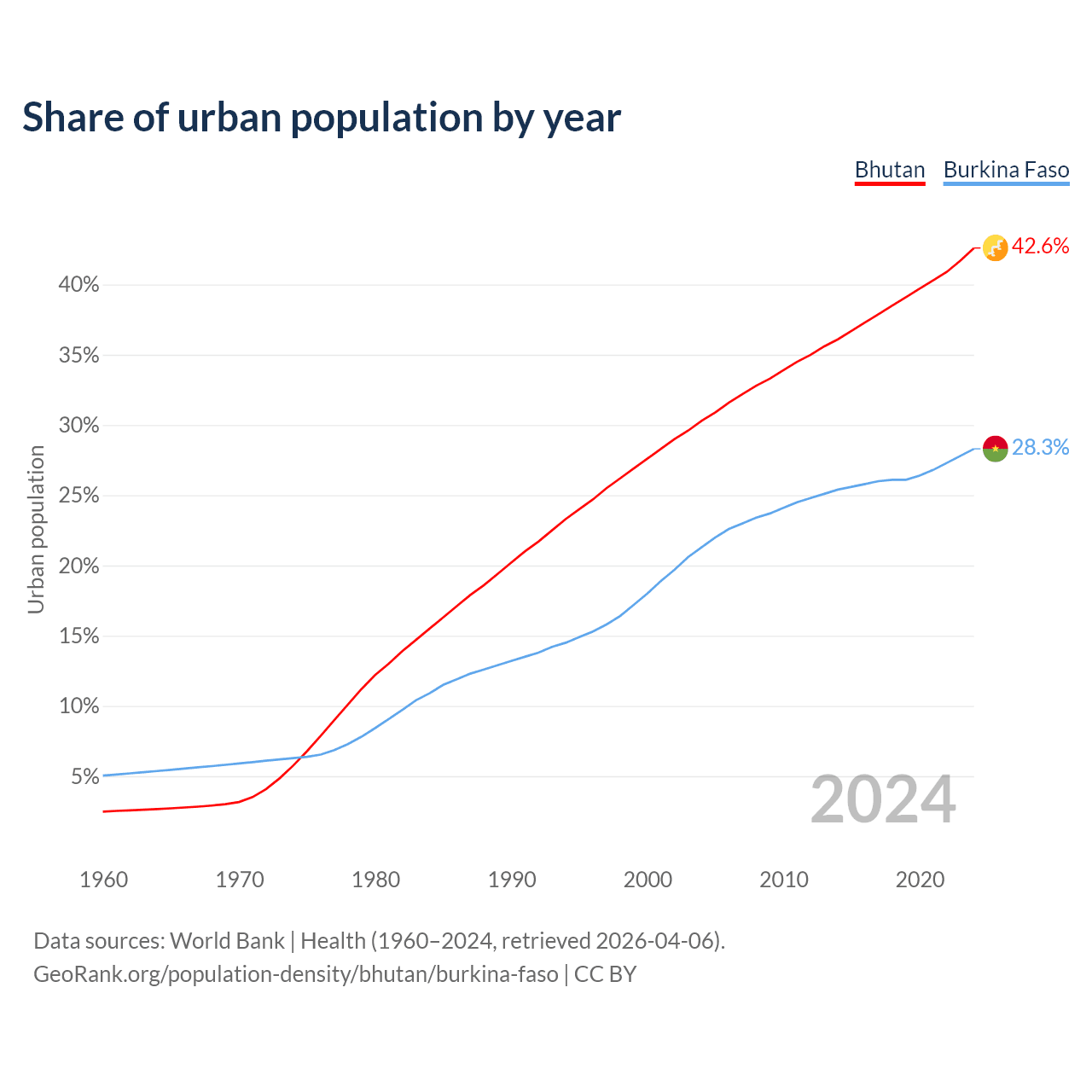 From 2004 to 2024, the share of urban population changed from 30.3% to 42.6% in Bhutan and from 21.3% to 28.3% in Burkina Faso.