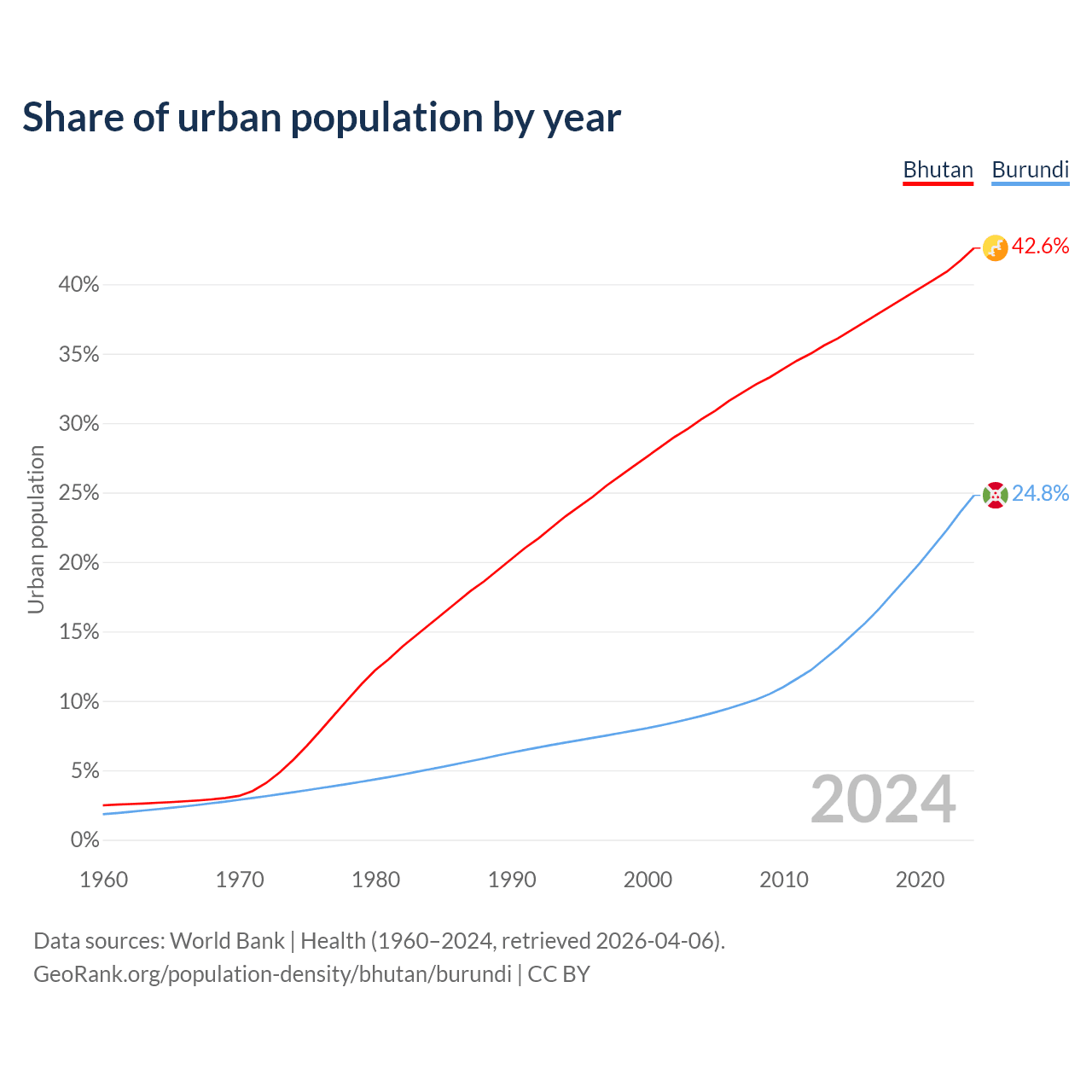 From 2004 to 2024, the share of urban population changed from 30.3% to 42.6% in Bhutan and from 8.92% to 24.8% in Burundi.