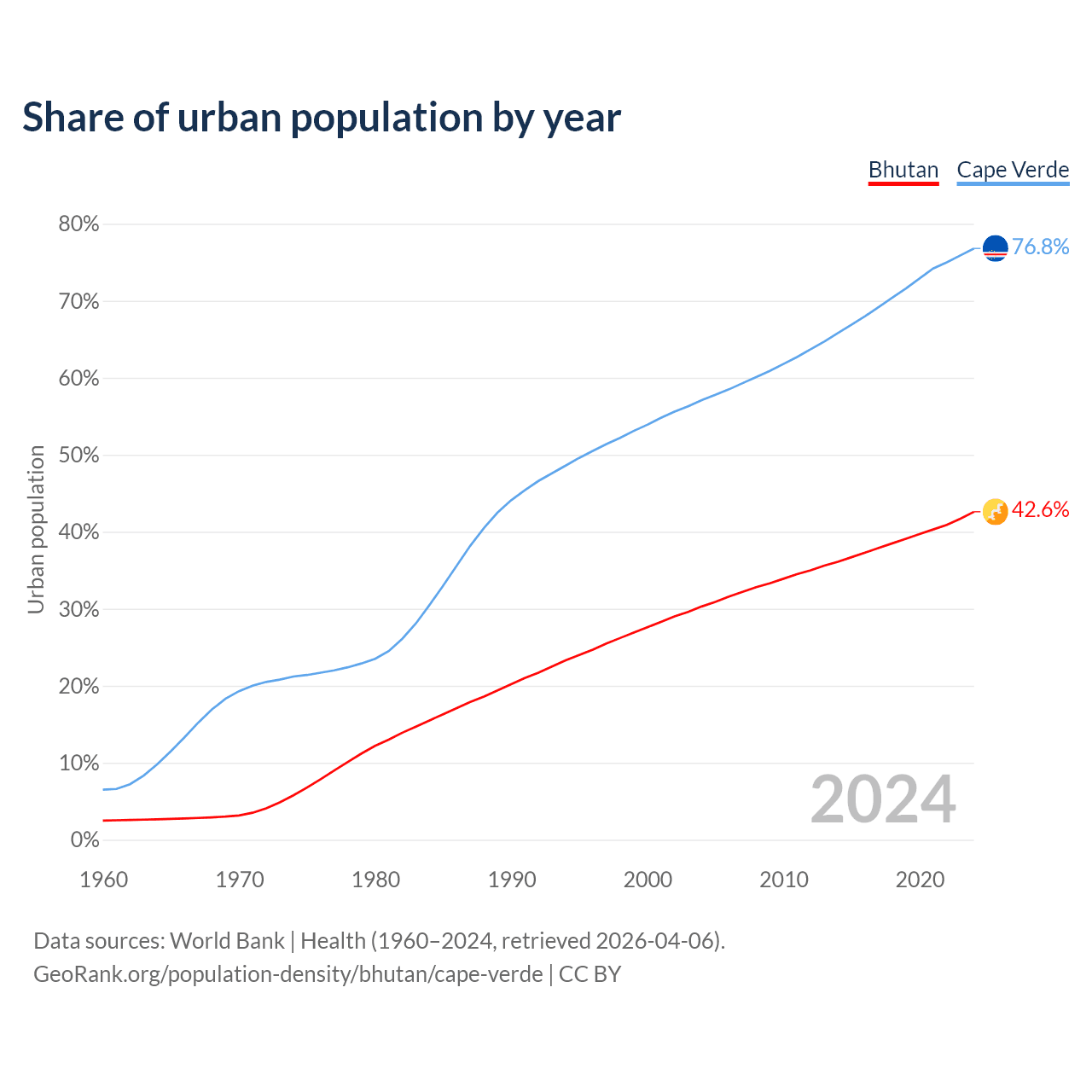 From 2004 to 2024, the share of urban population changed from 30.3% to 42.6% in Bhutan and from 57.1% to 76.8% in Cape Verde.