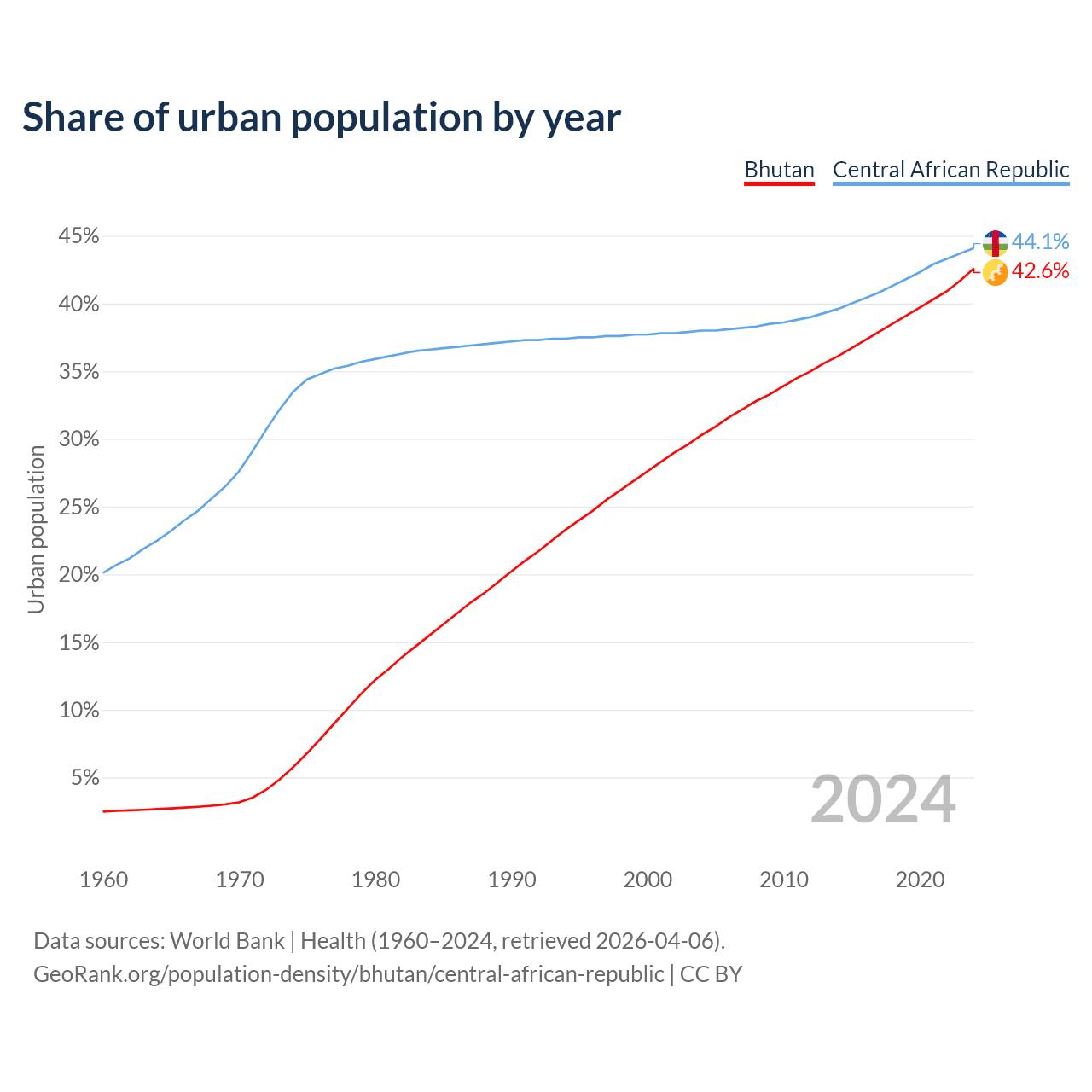From 2004 to 2024, the share of urban population changed from 30.3% to 42.6% in Bhutan and from 38% to 44.1% in the Central African Republic.
